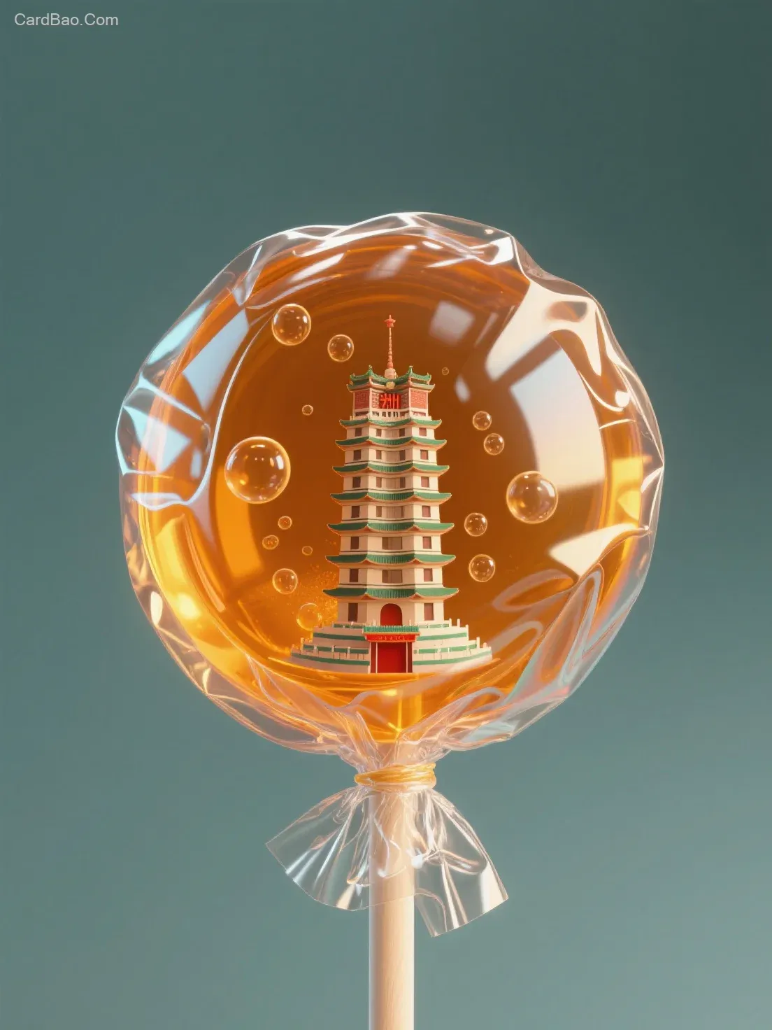 画面底部伸出一个琥珀色的球形棒棒糖,内部气泡,垂直居中画面,棒棒糖的糖果里面封存着郑州二七塔,糖果的外面是一层褶皱的镭射材质的透明塑料,密封环境,纯色背景,OC渲染,写实摄影,海报设计