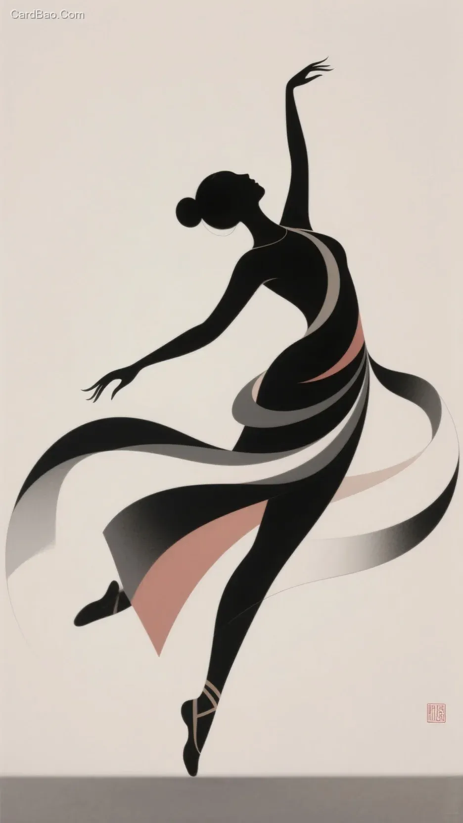东方优美女性舞者以旋转姿态以抽象化呈现,身体轮廓简化,流畅曲线的伸展肢体,纯色或简约几何空间背景,艺术抽象风格,几何线条和色块构成轮廓,特写镜头,简约氛围,形式美感突出,Liuhua风格,无文字无字母无印章