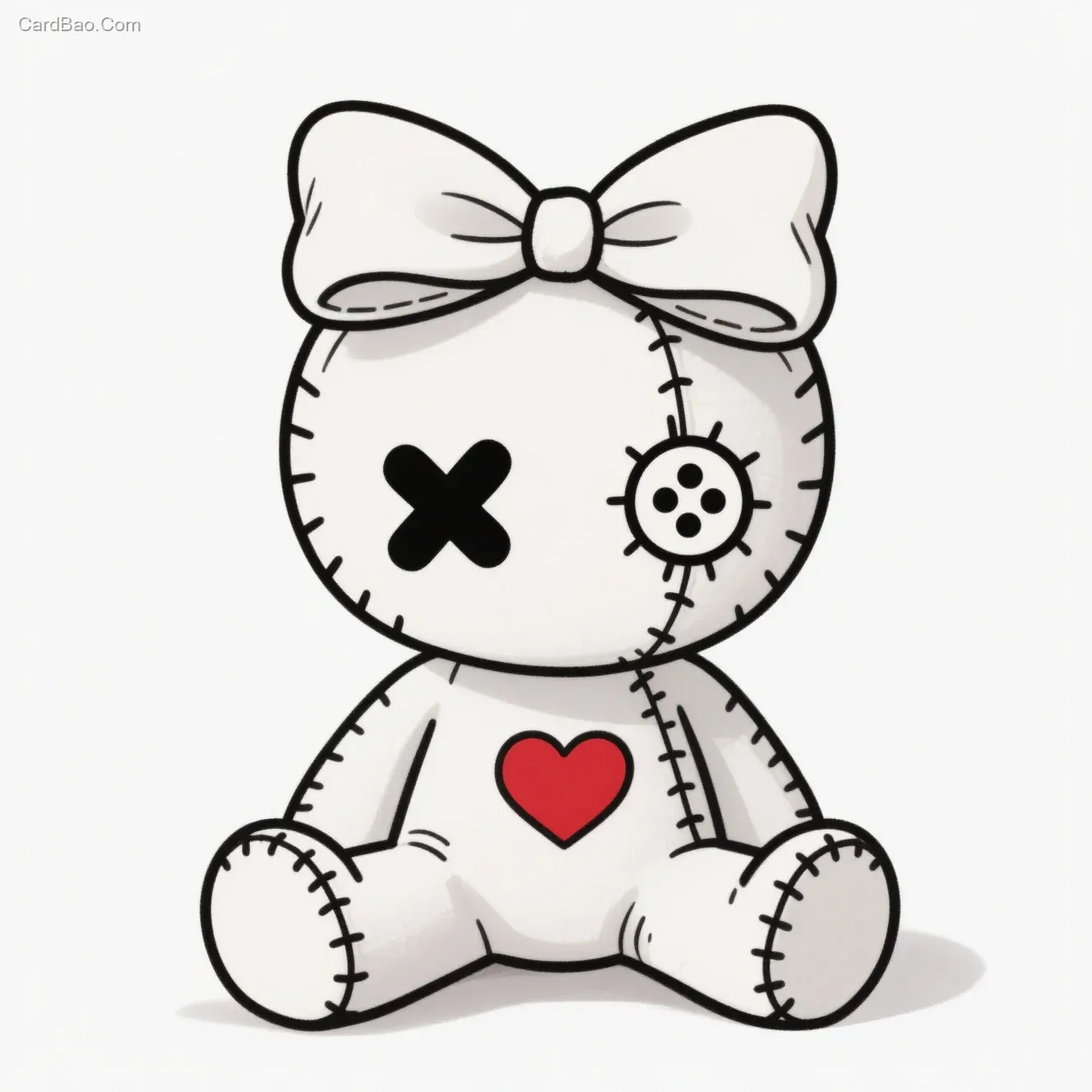 卡通风格插画,主体是一个拟人化的布偶娃娃。娃娃整体为白色,头顶系着一个大大的蝴蝶结。它的左眼是黑色 X 形,右眼是带有四个圆点的纽扣造型,脸部有黑色缝线装饰,似手工缝制。娃娃的身体上有一个红色爱心图案,呈坐姿,背景为纯白色,整体风格可爱又带点俏皮的诡异感。