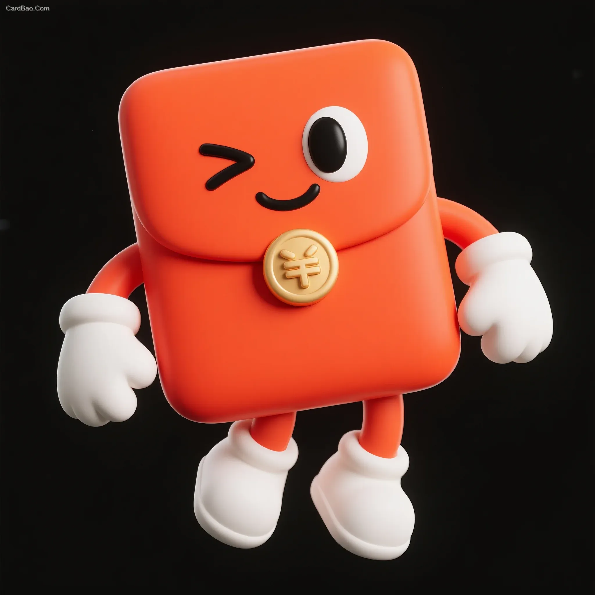 3D cartoon style, simple orange-red red envelope, with large white gloves and paws, one eye winking, one eye wide open, large black eyes, smiling expression, overall soft and cute, character floating, matte plastic texture, high definition, black background, bright and lively