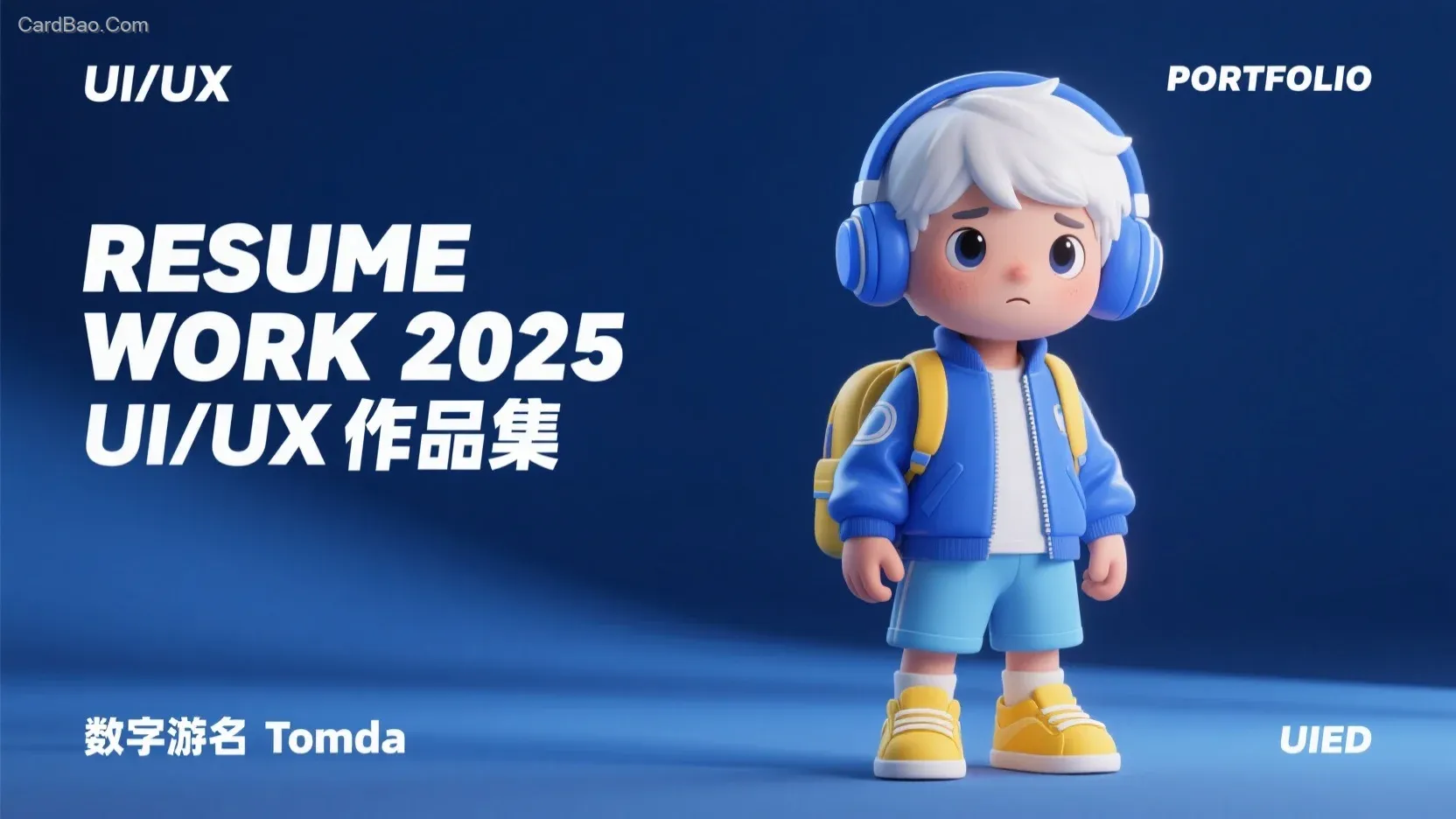 一个卡通风格的男孩,穿着蓝色夹克衫、白色短发,戴着蓝色耳机和黄色背包,身着浅蓝色短裤,穿着黄色运动鞋。他表情略显忧郁,眼睛圆而深邃,嘴唇微瘪。男孩身形圆润可爱,站立姿态,面向画面正前方。画面背景为深蓝色,营造一种安静、时尚的氛围。整体风格是3D渲染,色彩鲜艳而饱满,光线从画面左侧打来,突出人物细节。作品标题“RESUME WORK 2025”以及“UI/UX作品集”以白色大字体呈现,位于画面左边。左上角“UI/UX”左下角“数字游名Tomda” 右上角“PORTFOLIO”右下角“UIED”