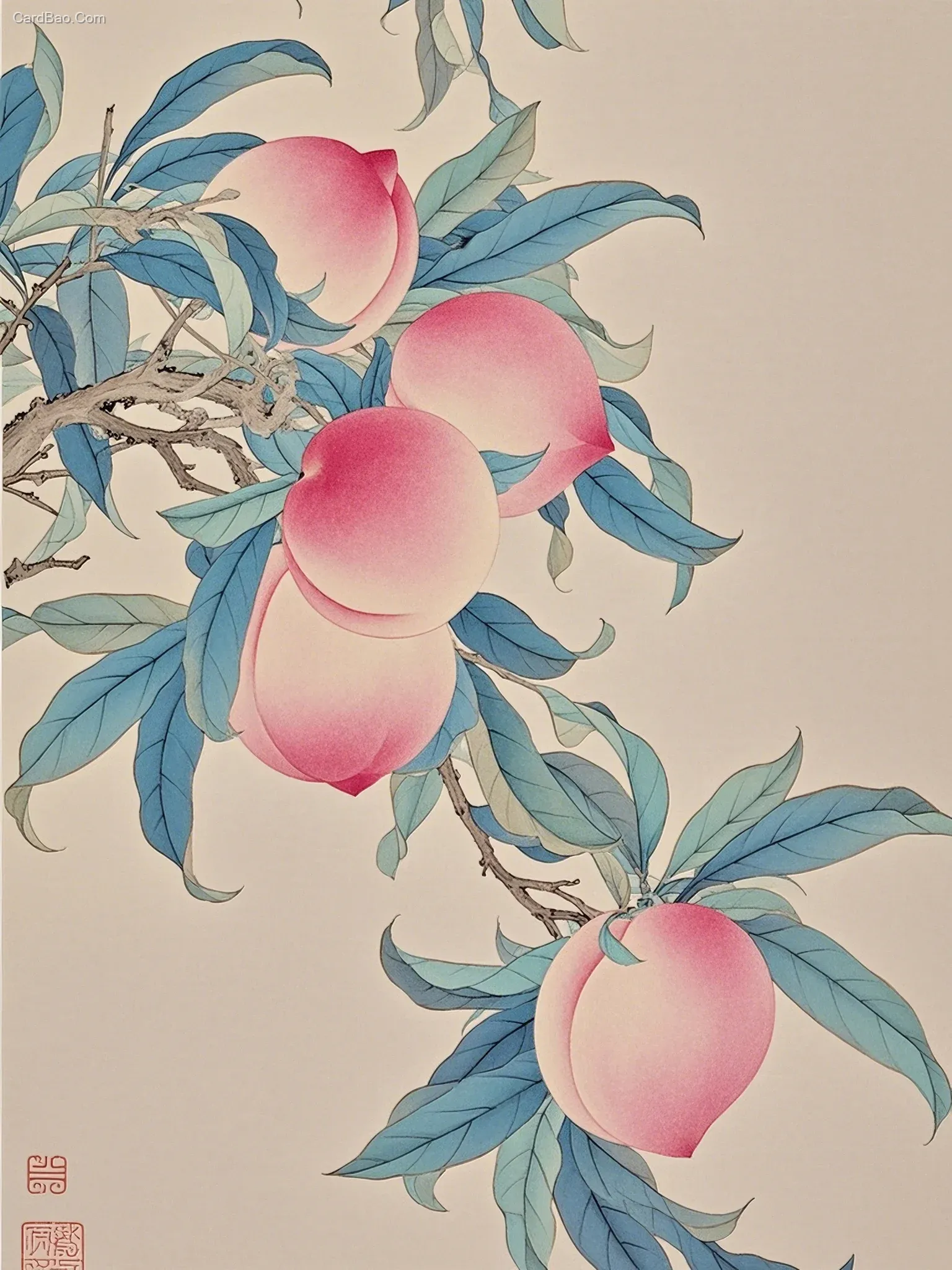 精致工笔插画,古风国画,线条细腻,高饱和度,色彩鲜艳,桃树枝头高悬而下,左上方斜向下入画,枝头长着五个圆润的淡粉色桃子,莹润油亮的蓝绿色叶片,弯曲流畅的的藤蔓,极简纯色(米白色)背景