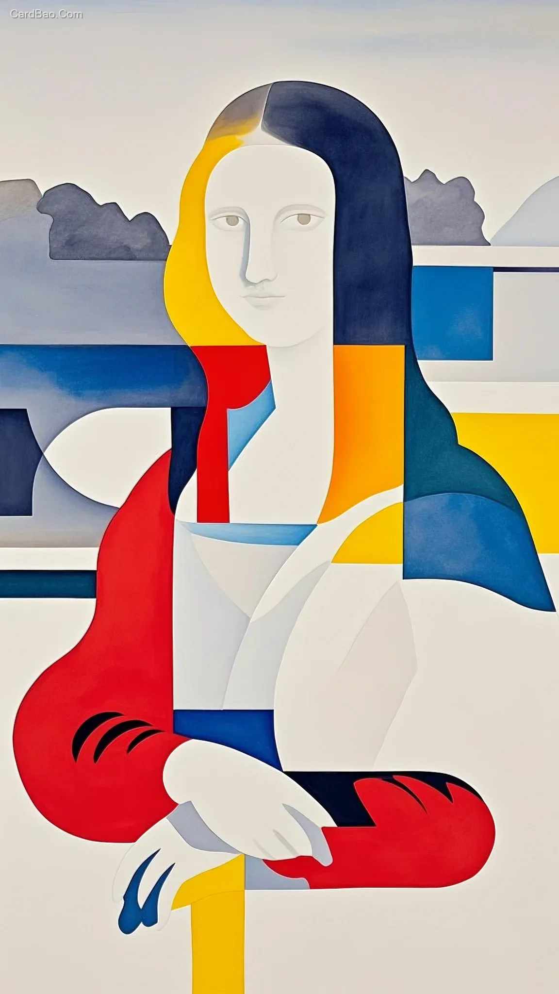 简笔插画,蒙德里安,用流体水彩画一幅夸张的蒙娜丽莎,表情优雅,富有艺术感,背景纯色干净。极简主义。
