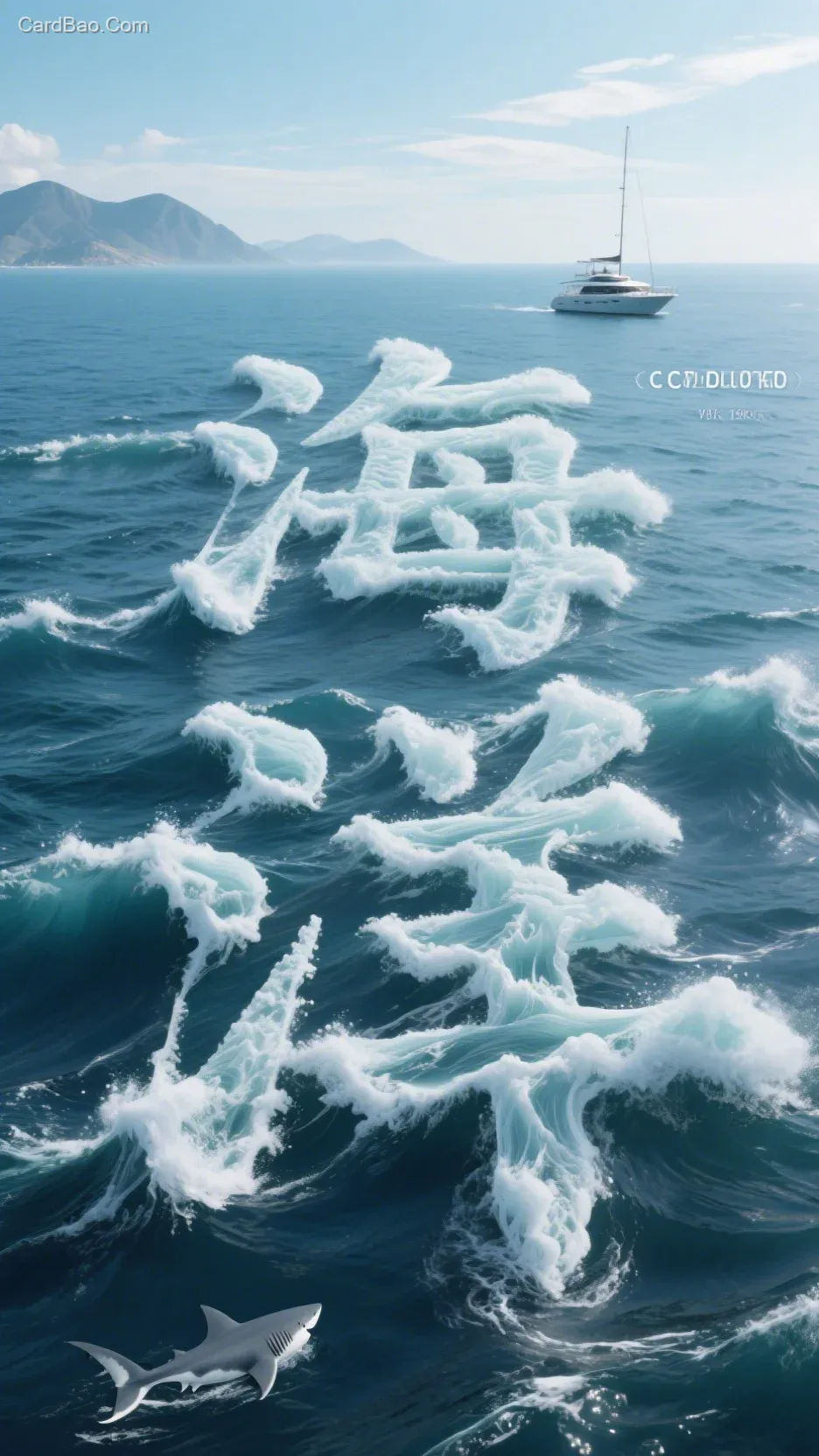 On the vast sea surface, huge landscape characters "海洋" (Ocean) are displayed, with each stroke composed of rolling waves and surging spray. In the distance, distant mountains are faintly visible, along with a beautiful sky, yachts, and faintly visible sharks in the sea. Rendered using 3ds Max and V-Ray, this 16K ultra-high-definition scene features each stroke of the characters naturally formed by natural wave elements—no artificial traces, seamlessly integrating with nature as a whole. The direction of these waves combines to form the characters "海洋", exuding a magnificent and imposing aura.