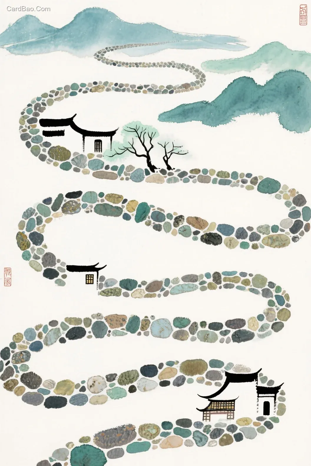 禅意线体插画:1.5,中国风岩彩材质绘画:2,先锋艺术插画,水彩中国风风格插画,晕染,笔法随意洒脱,晕染,大写意,大色块涂抹,高饱和度,凭借极致简约与构图,形成强大海报视觉张力,是大师级平面构成佳作画面,要有留白感。石子以蜿蜒型曲线蔓延整个画面,呈点彩画质感,缥缈梦幻,曲线间叠加大量的中国风山水和中式建筑。