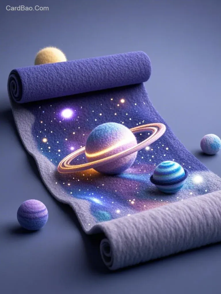 高角度拍摄,移轴摄影,立体,一个羊毛毡材质的画卷设计,星河宇宙小星球,毛毡材质,毛毡工艺,梦幻的散景,流光,星汉灿烂,炫彩光影,发光,强光,浅景深,超细节,3D立体,流动丝绸,C4D建模,高清渲染,影棚灯光,32k,超高清细节处理,纯色背景