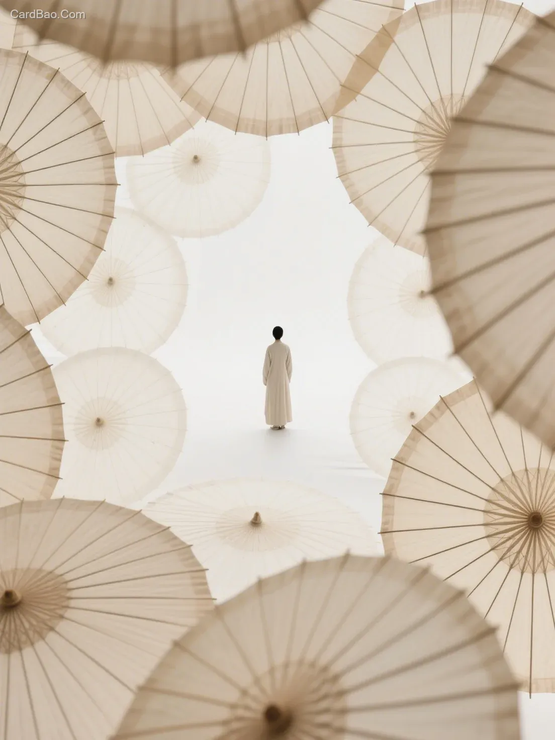 高视角,特写,巨大的空间,油纸伞,叠加,大面积留白,空灵,简约,写意,模糊,前后层次感,一个孤独的人,米白色,由上而下渐变,颜色由深到浅渐变,视觉冲击,东方美学