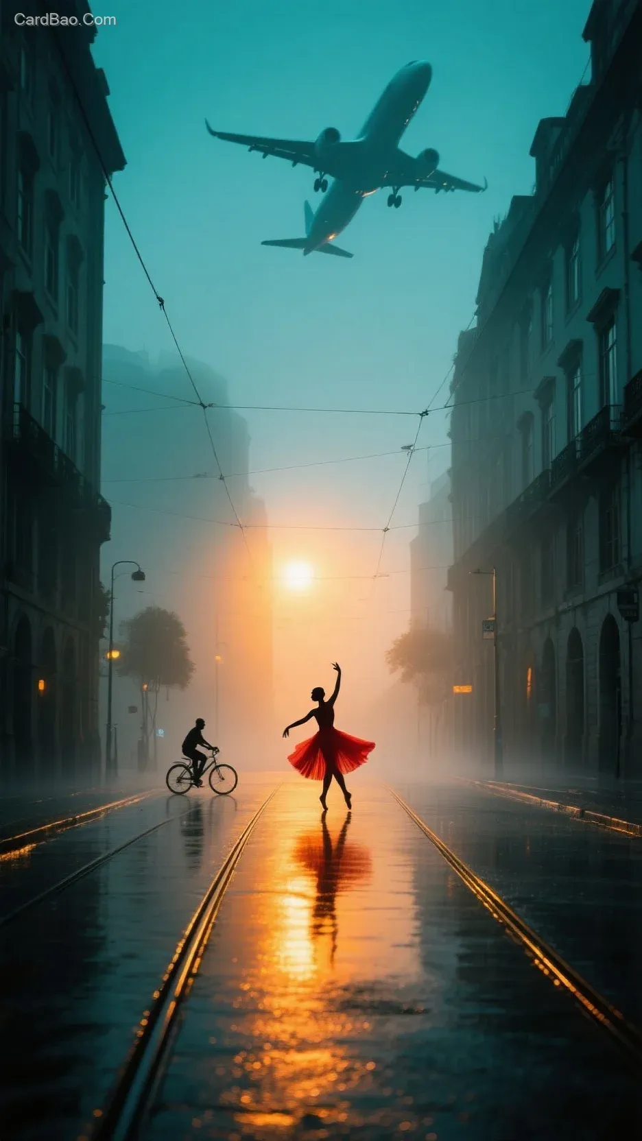 Long exposures capture the streaking shadows of cyclists intersecting with tram tracks, forming visual vectors. Within the melancholic atmosphere, the real cityscape is distilled by dusk into teal-and-orange slices of time. A dancer in morning mist dissolves into a flowing silhouette along the chiaroscuro boundary, while orange-yellow light spots grow along the street’s leading lines like rings of memory within the textured teal-gray architecture. Unconventional framing, emotional resonance, and narrative depth—suddenly, a doomed plane streaks across the sky.