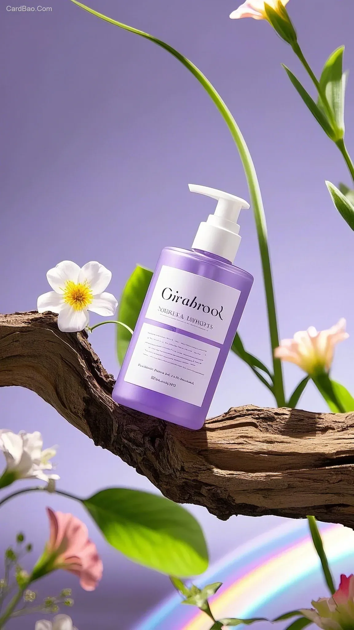产品拍摄,质感,一款淡紫色不透明沐浴露包装,放在天然木头上,背景纯色,莫兰迪紫色为主调,产品背后绿植和花朵点缀,五彩斑斓的光,大师作品,获奖作品,超高清,空间感,艺术感,高级,