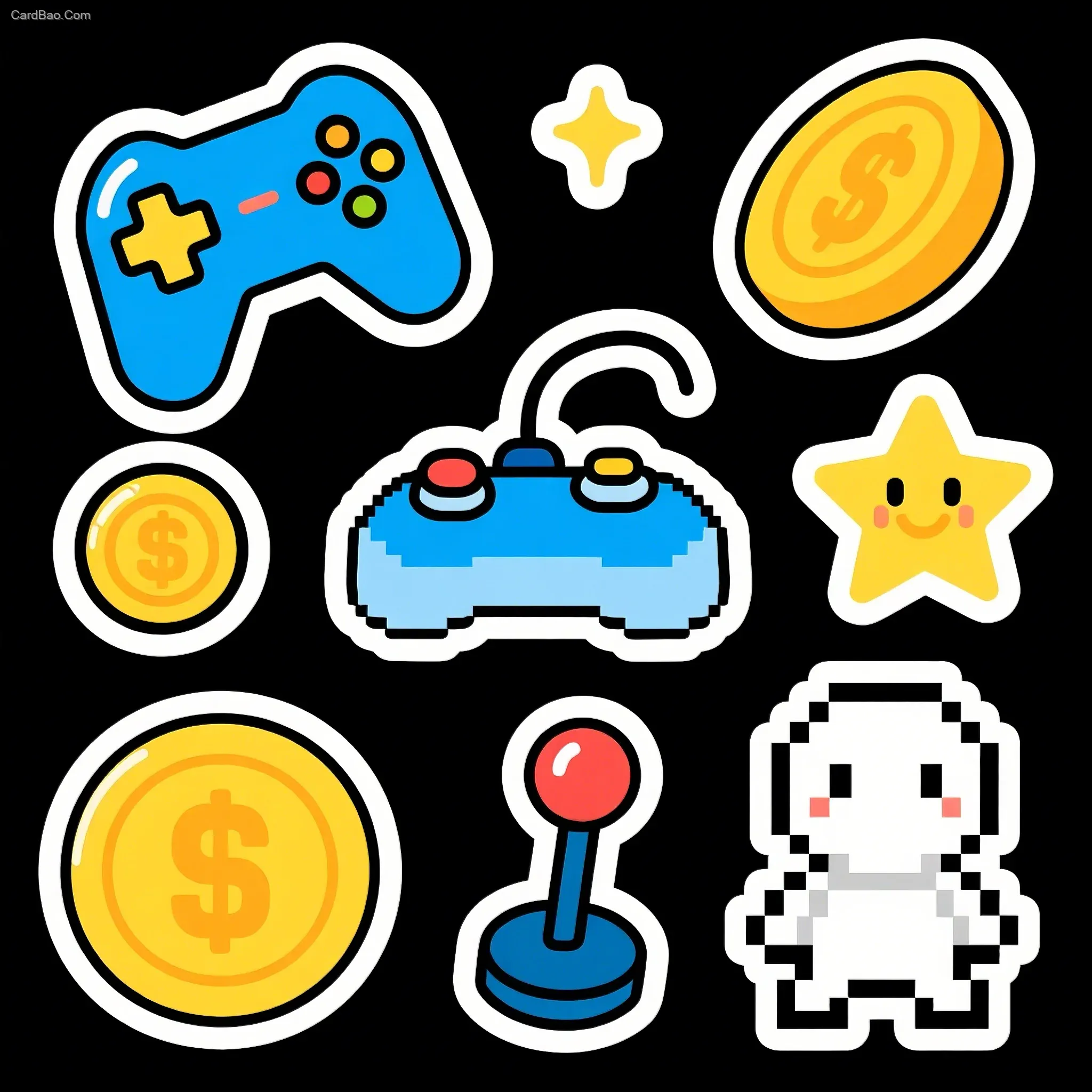 Cartoon-style game stickers, such as game controllers, coins, joysticks, stars, and pixelated characters, with blue, yellow, and white as the main colors.