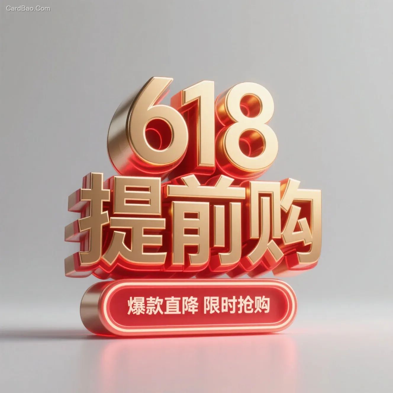中心对称构图、立体字组“618提前购“金属金主标题与“爆款直降限时抢购"多层描边副标题,文字表面流动红光特效,字体转角处锐利反光处理,电商促销主视觉设计,正式视角,霓虹光效,纯浅灰色色背景空间
