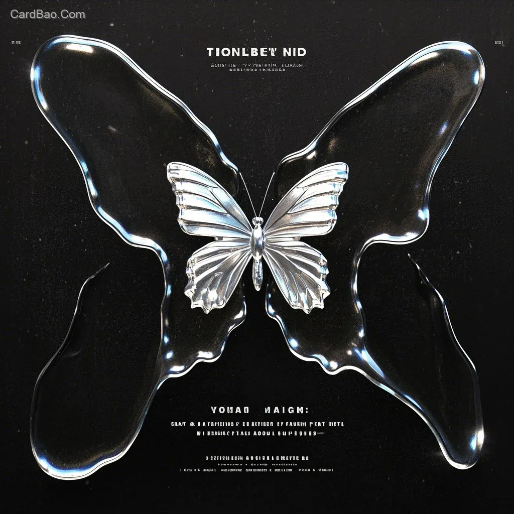 Vintage film grain, liquid silver metal, silver and colored sheen, irregular liquid shapes distributed around the frame, butterfly with silver metallic texture, centered horizontally and vertically, creative artwork, metallic luminous texture, ghosting and chromatic aberration, pure black film grain noise background, minimalist style, movie poster, poster design, chromatic aberration, glitch effect, typography of movie information description text at the bottom