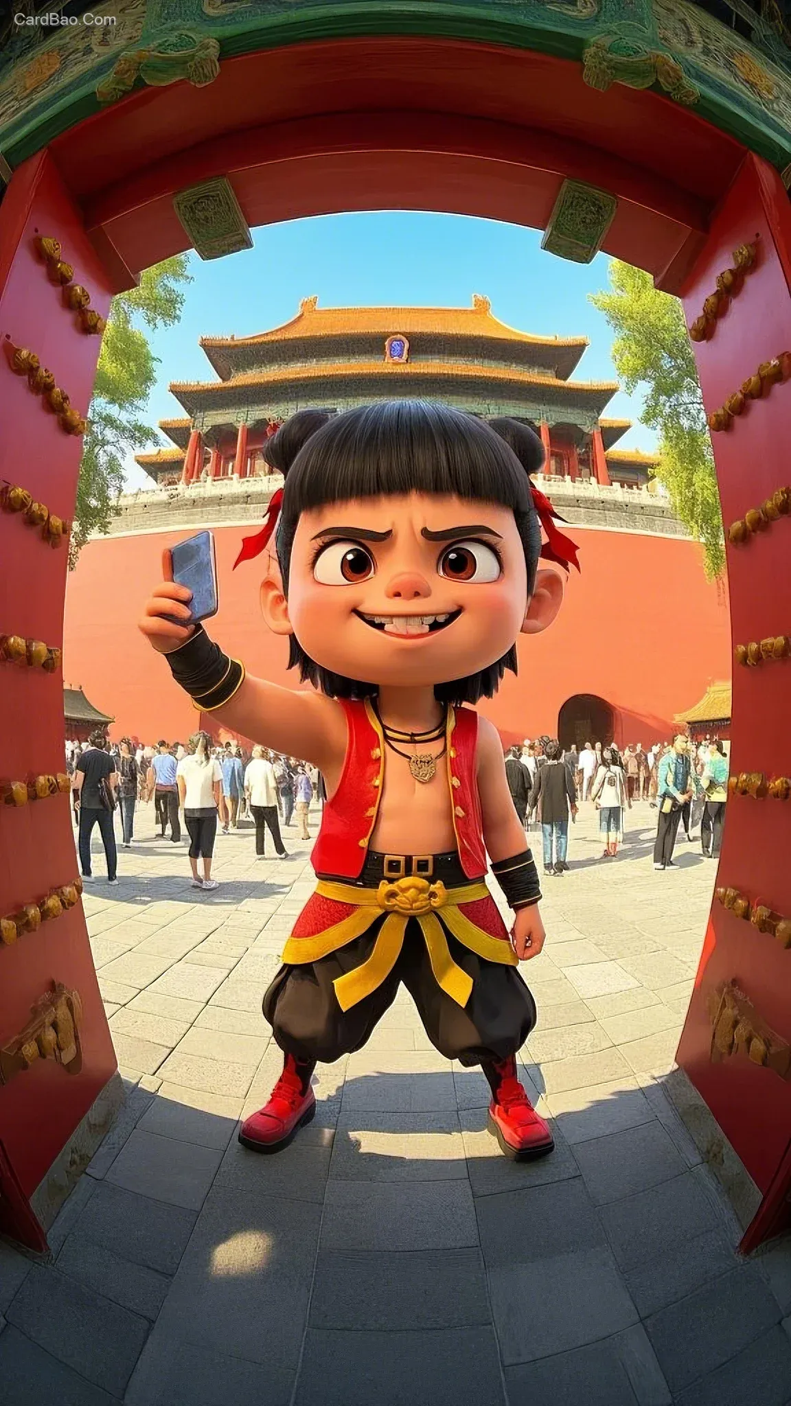 Fisheye lens, a giant Demon Child Ne Zha standing in the Forbidden City taking a selfie, making a funny face, background: the Forbidden City, many tourists, super cute, surreal.