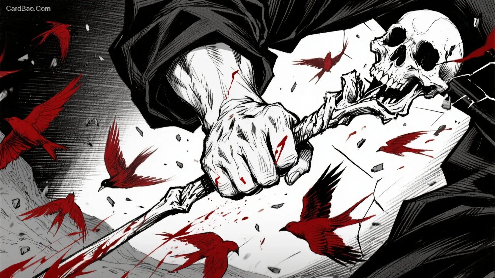 特写慢镜:一只大手握骷髅杖头,骨杖逐帧碎裂,无数红鸦飞散, --细节:血丝褪色、沙尘粒子