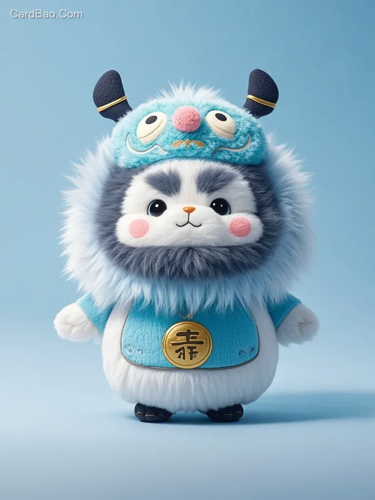 a cute character of 钟馗, fluffy, plush, pastel colors,pure blue background