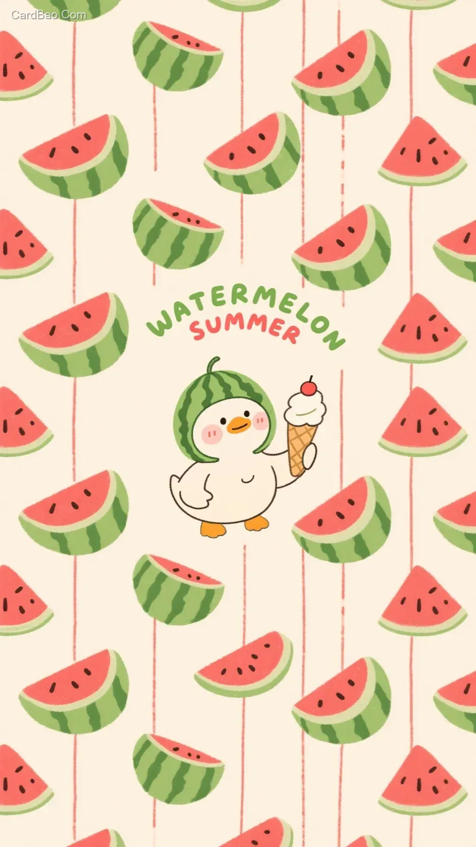 “创作一张治愈系夏日西瓜主题卡通壁纸,画面以浅米色为底。主体是头戴西瓜皮帽的软萌卡通角色,表情可爱,搭配小鸭子、冰淇淋互动。穿插鲜红带黑纹的西瓜切片、整颗西瓜,用绿色、红色细线条纵向分割画面成多列,规律重复排列角色与元素。加入手写风格‘WATERMELON SUMMER’(绿色+红色字体)点缀。色彩柔和明亮,线条圆润,营造轻松活泼的夏日清新氛围,构图为连续重复的壁纸式排列,元素分布疏密平衡 。”