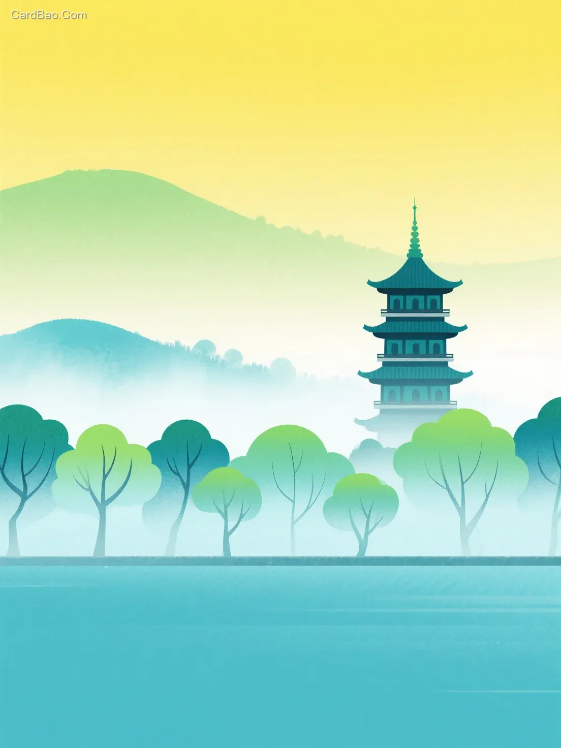 黄色,绿色,春天。复古风格,不同色阶,东山魁夷风格,雾气,意识流,意境,交错叠加,极简,朦胧,如梦似幻,艺术美学,高分辨率,晕染,中式审美,留白,极简主义。地标插画--杭州市1.画面主题:西湖地标插画 2.画面风格:渐变矢量风格,蓝色渐变背景 , 整体视觉清新、大气,立体风格