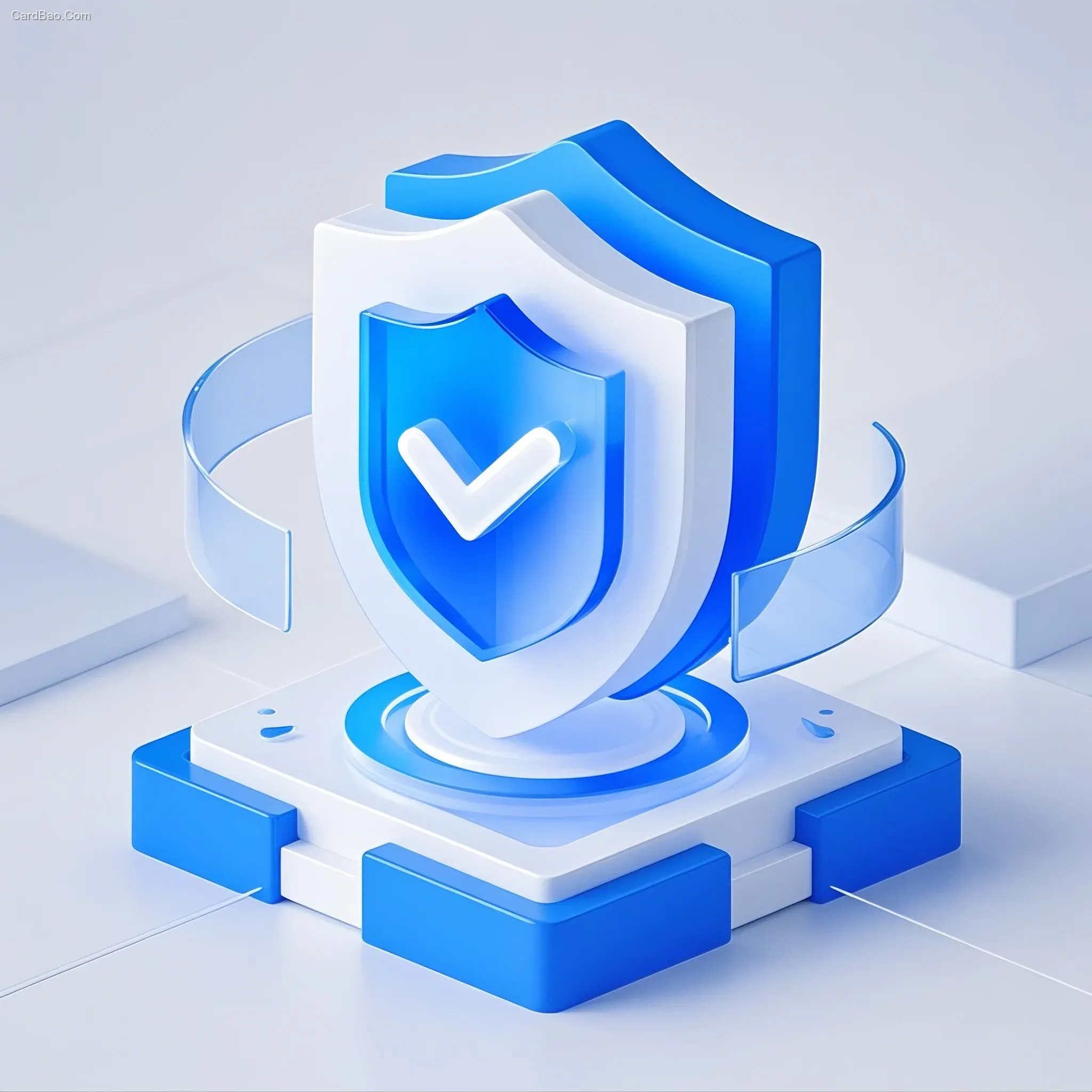 Icon symbolizing safety and protection. The main body of the icon consists of two overlapping shields; both shields are of the same size and blue in color. There is a checkmark symbol on the lower shield, while the upper shield has only the shield outline with no other elements. The upper shield is made of glass material, transparent, revealing the lower shield underneath. White background, C4D, 4K.