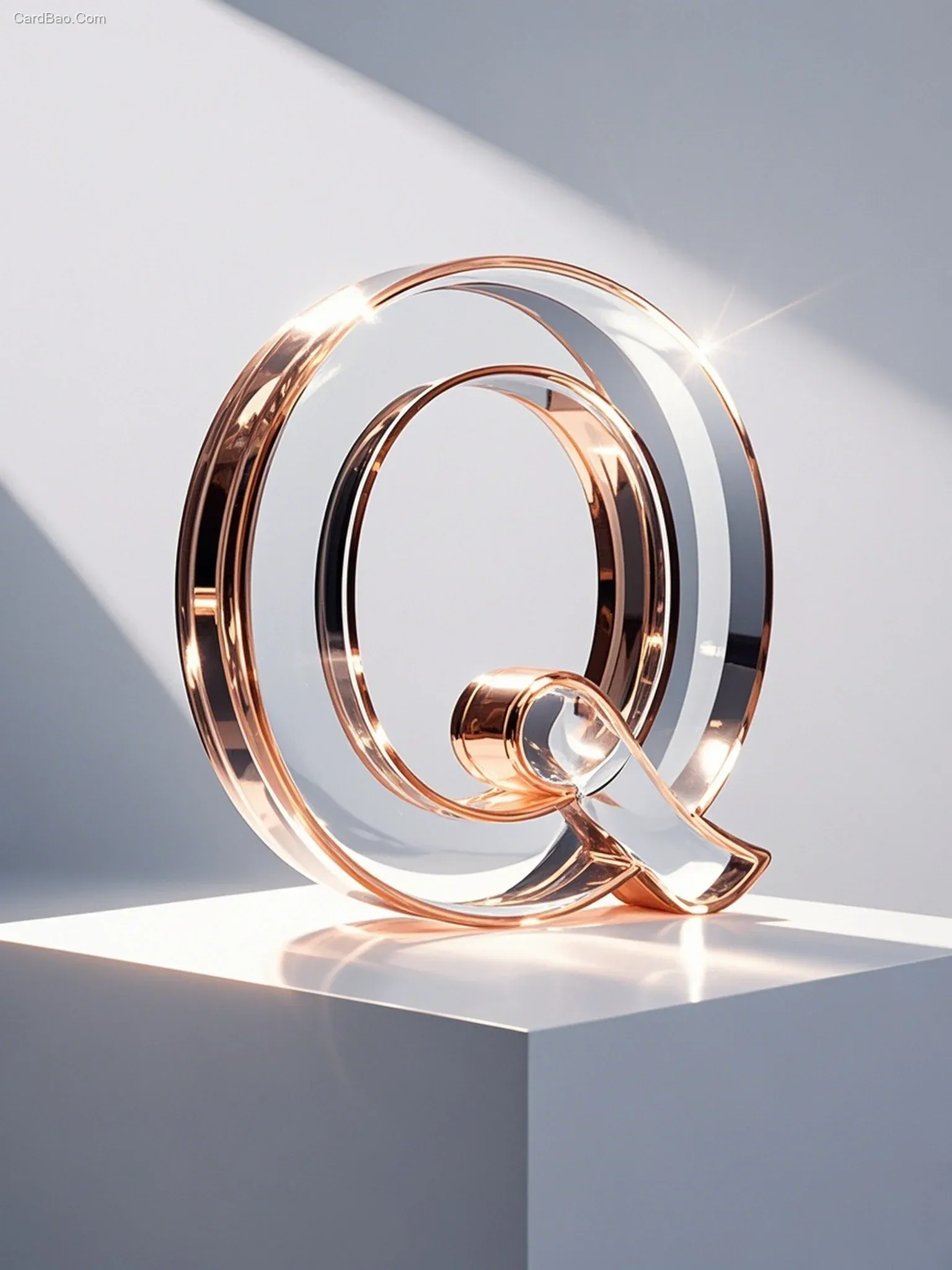 这枚字母"Q"由晶莹剔透的玻璃材质打造,通体透明澄澈,搭配白底上的玫瑰金金属质感,尽显高端奢华气质。作品采用Cinema 4D风格渲染,概念艺术美学设计,完美复刻Michael Bayne的标志性风格。高解析度的玻璃雕塑材质呈现出令人惊叹的细节表现,极简主义风格白色背景,完美细节,16K,OC渲染。