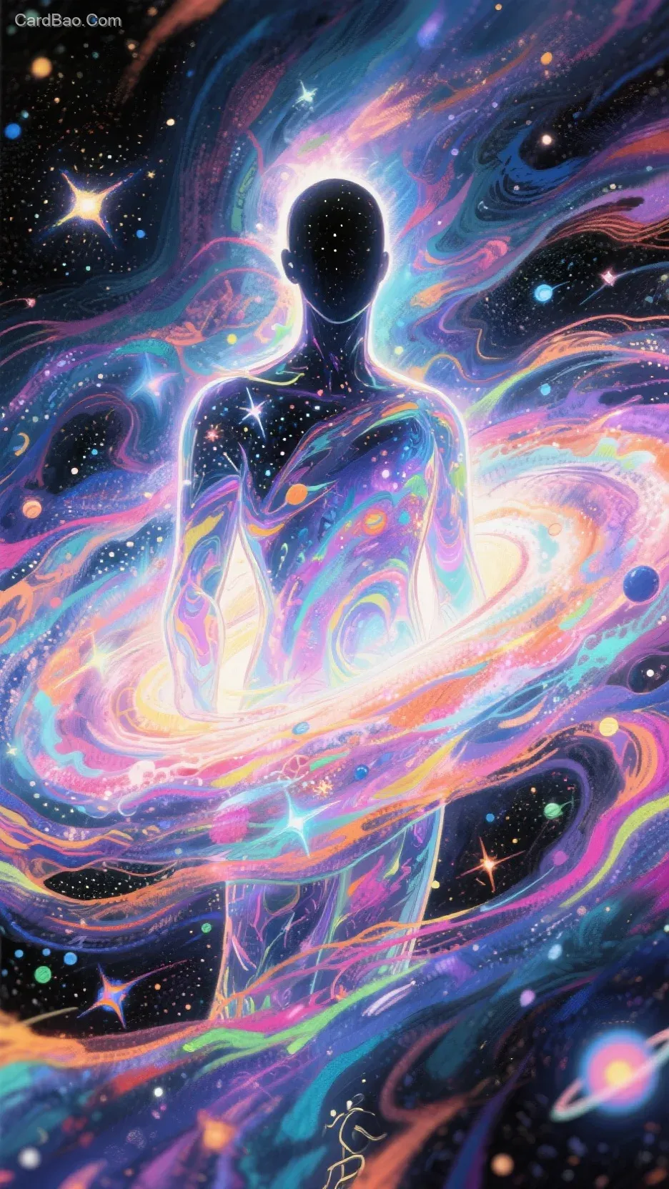 ,混沌透明的宇宙星云漩涡中心一个宇宙神明隐约出现,身体透明飘渺由流动星空,星云,星体组成,无面人,多重面幻像 虚与实 虚影动态模糊,丰富多彩高饱和色彩致幻 曜变 动态模糊,荧光笔马克笔结构平涂 超细节 , 意识流绘画,高饱和荧光光影流动,胶片感拍摄,新视觉,