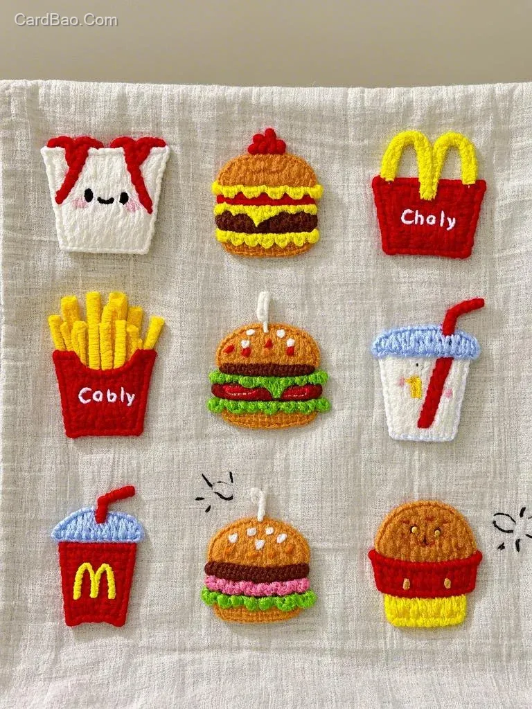 Embroidery of a set of McDonald's meal food, cute, embroidery pattern, exquisite stitching, cute style, minimalist, linen cloth, small embroidered icons, realistic, 3x3 grid layout, no grid lines