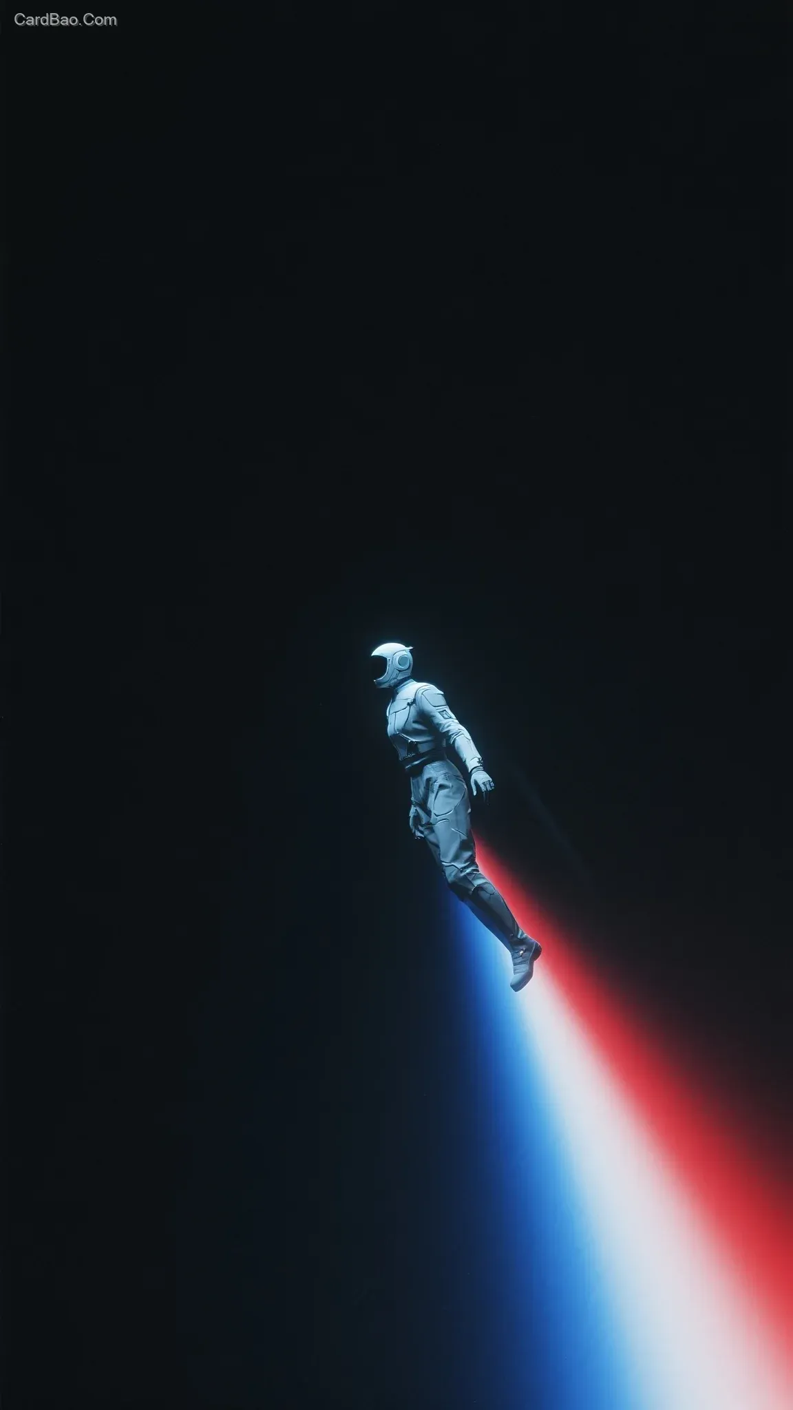 边缘角落的极小的一道蓝红白渐变光影,一个飞行的人在光影中,大量留白,大量留白,背景极简纯黑色