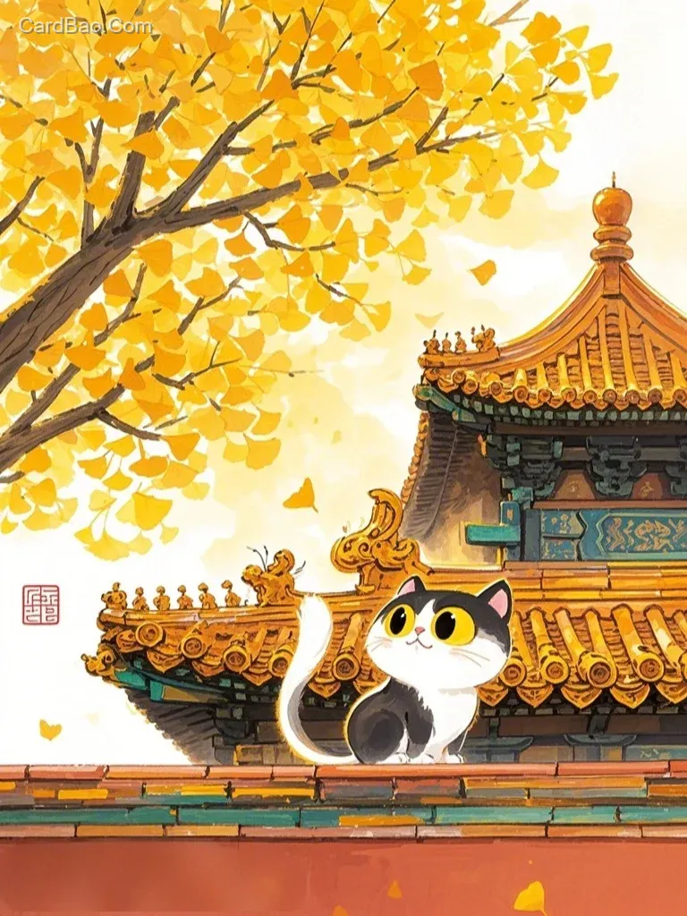 Illustration, clean brushstrokes, Qi Baishi, imaginative themes from children's picture books, a cat, the Forbidden City's roof, close-up of the cat, gold flecks, sunlight streaming down creating the Tyndall effect, ginkgo, soft colors, poster, fairy tale, sophisticated, clean lines, no text
