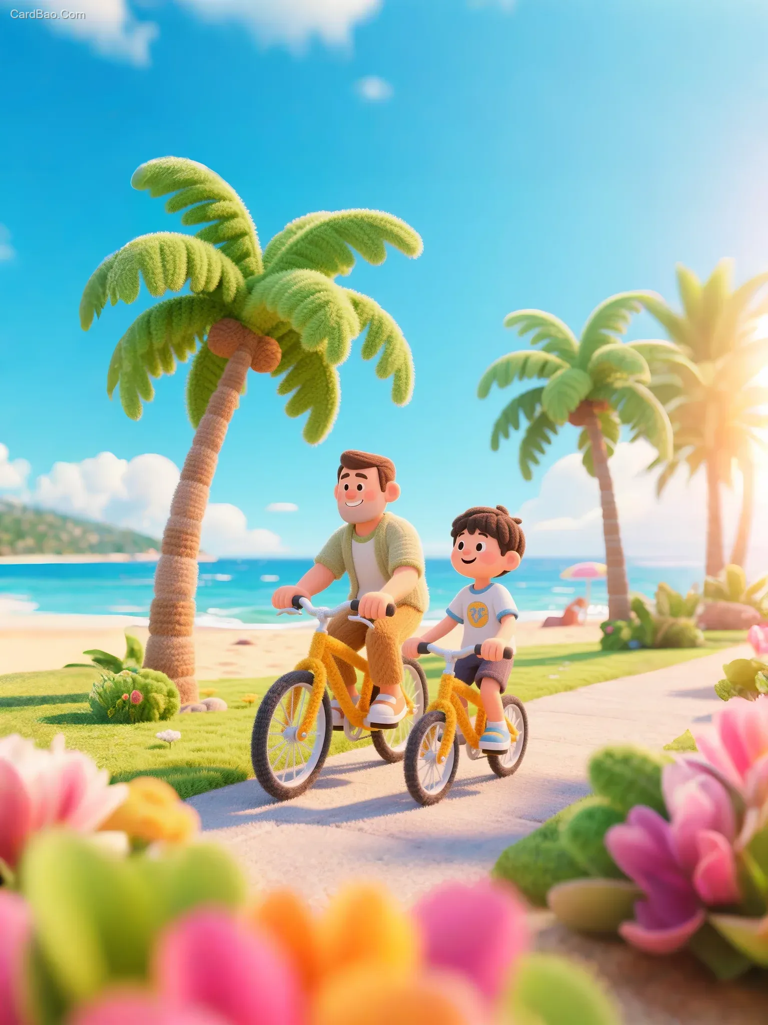 Plush yarn art painting, cartoon style, childlike fun, sense of storytelling, Father's Day poster, father and son cycling in the park, surrounded by beach, sea, and coconut trees