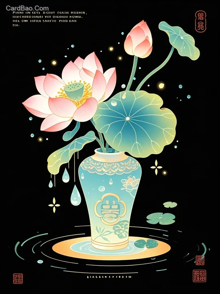 中国古风贴纸,q版卡通,一个中国花瓶里插着荷花,可爱卡通矢量风格插图,黑色背景,清新活泼的氛围