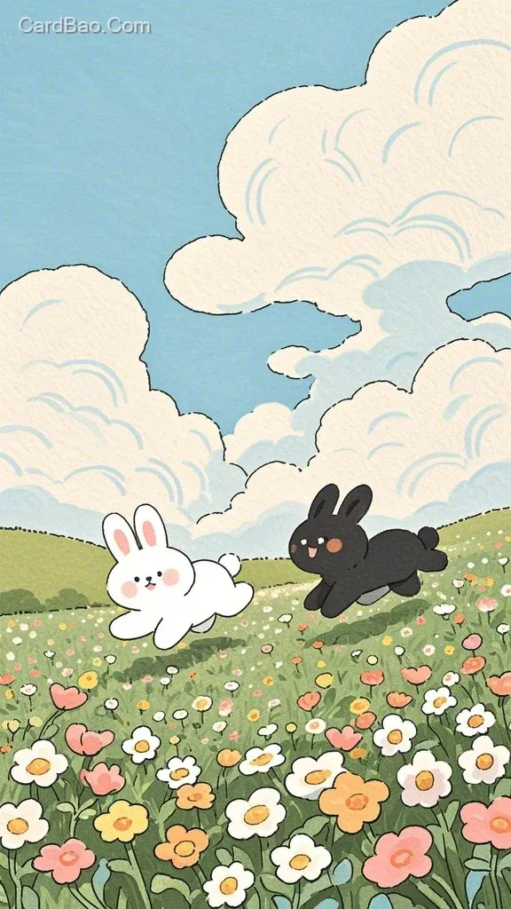 Hand-drawn illustration: A white rabbit and a black rabbit chasing and playing in a flower-filled meadow on the grassland, presented in a distant view. With wind-blown lines and negative space in the composition, it follows the style of artist Yeoniu Choi—simple line drawing, cartoonish, outlined with lines, exuding a cute and warm vibe. Characterized by a healing art style, it features simplicity, cleanliness, vibrant colors, grainy texture, relaxed brushstrokes, and distinct brushstroke质感.