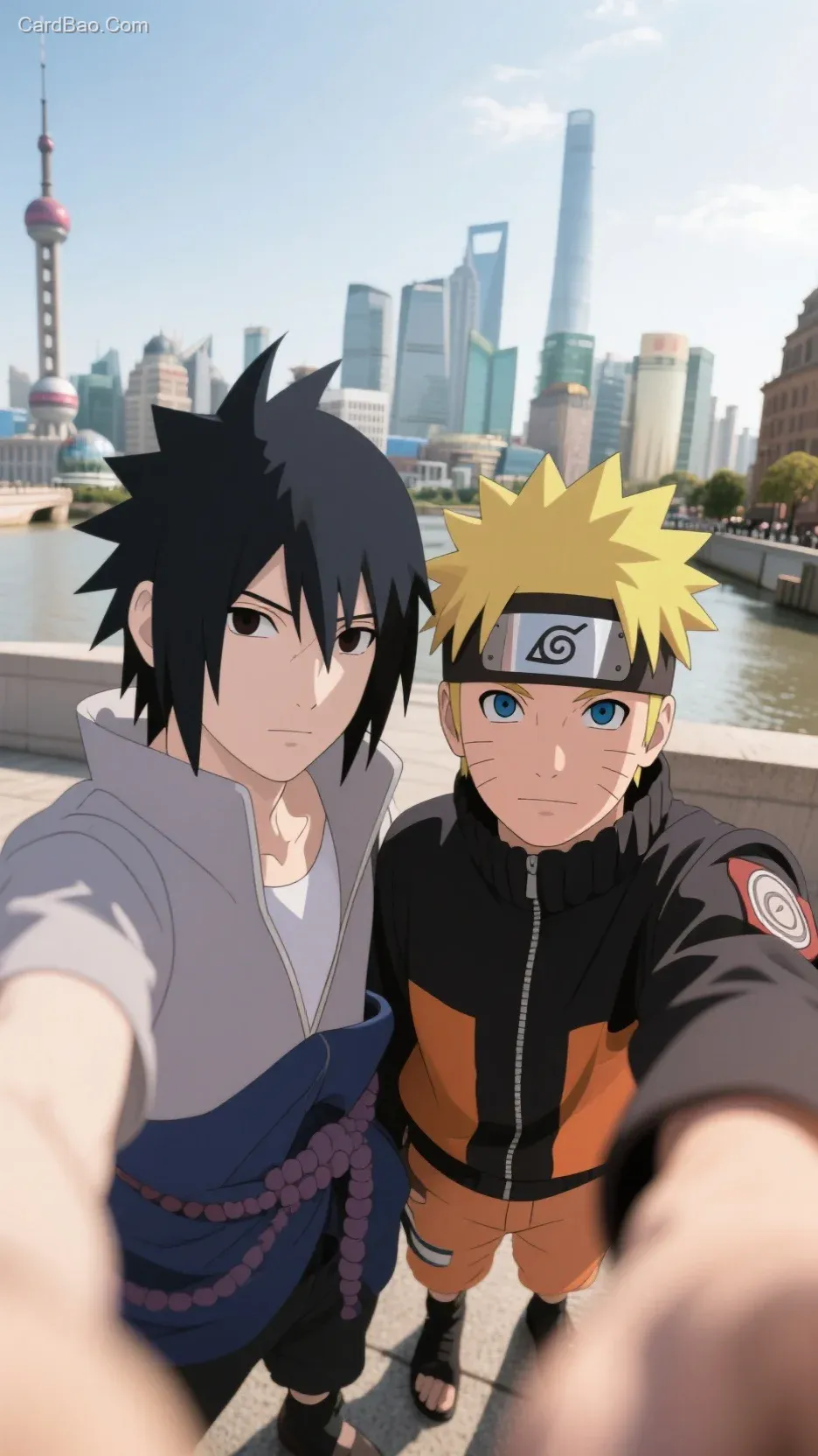 请你生成张极其平凡无奇的自拍照,没有明确的主体或者构图感,就是随手一拍的快照,照片略带运动模糊,阳光或室内打光不均导致的轻微曝光过度,整体呈现出一种刻意的平庸感,就像是不小心拍到的一张自拍。主角是火影忍者疾风传里的佐助和鸣人,背景是上海外滩
