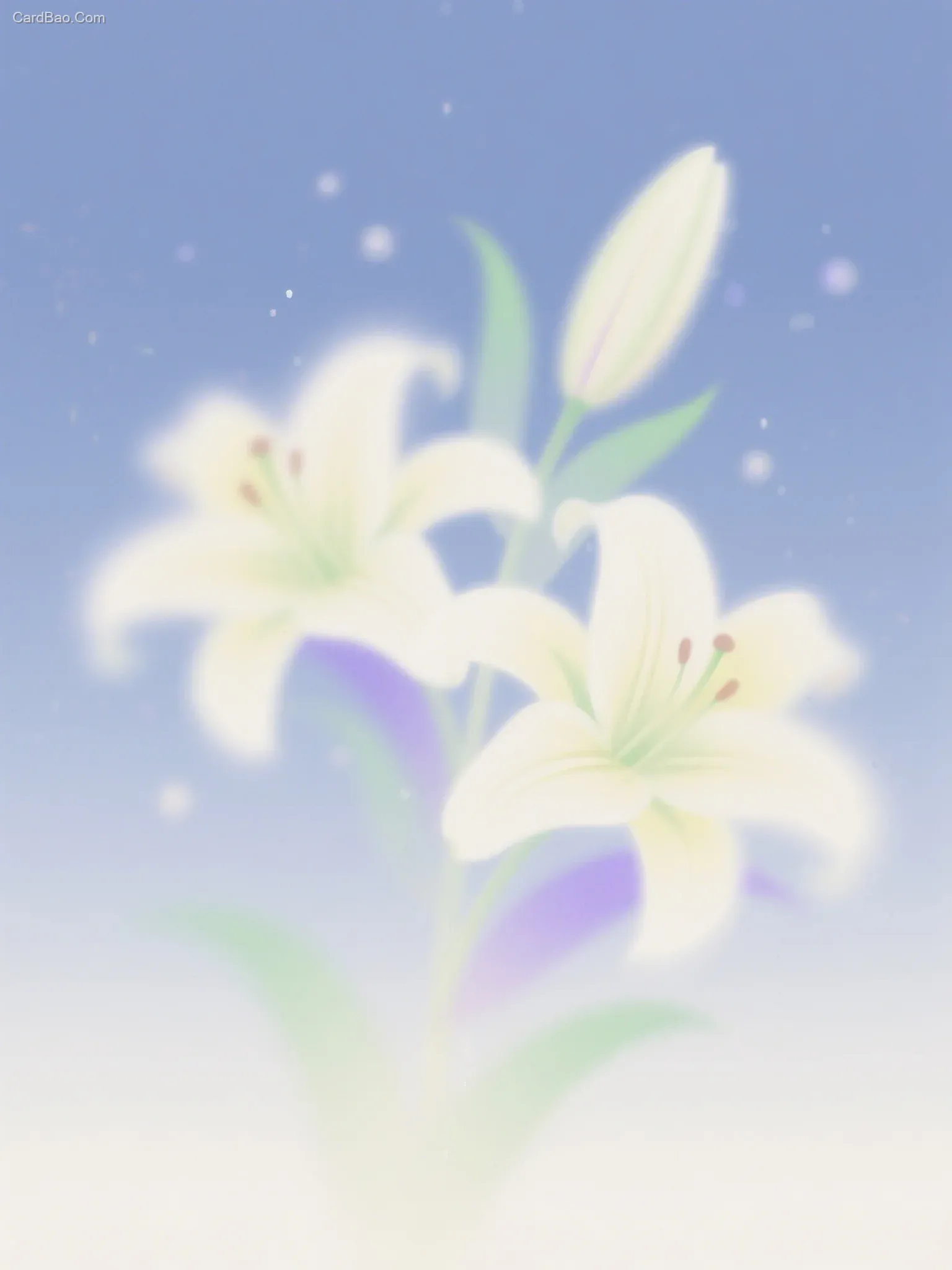 Surrealist illustration, particle diffusion, hazy and indistinct, Morandi colors, cream color palette, blending of light green, light purple, and light yellow color blocks, low saturation, lily, fictional, minimalist abstract, no dark areas, clean colors, blue-white gradient