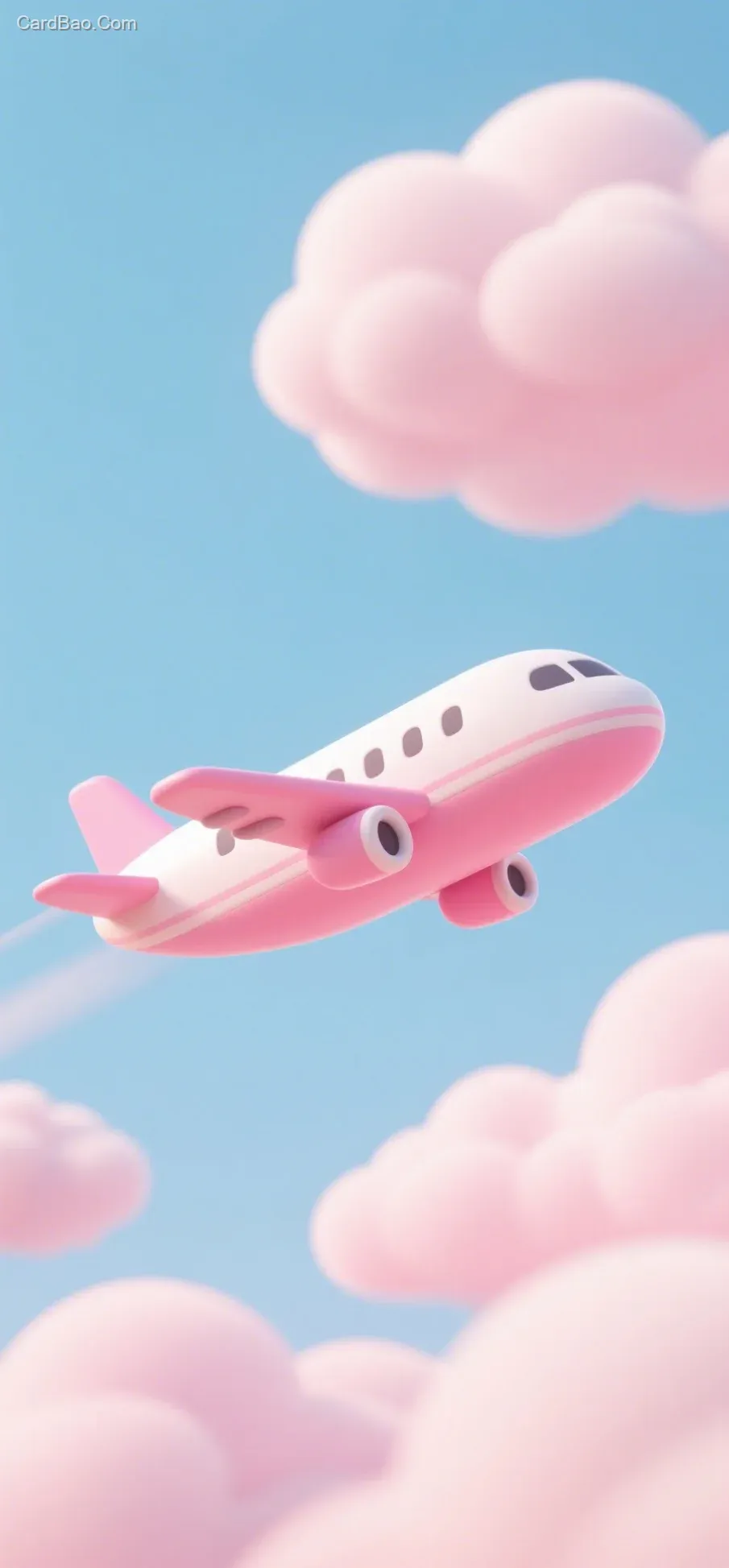 An airplane flying diagonally upward, cartoon, C4D rendering, pink and white colors