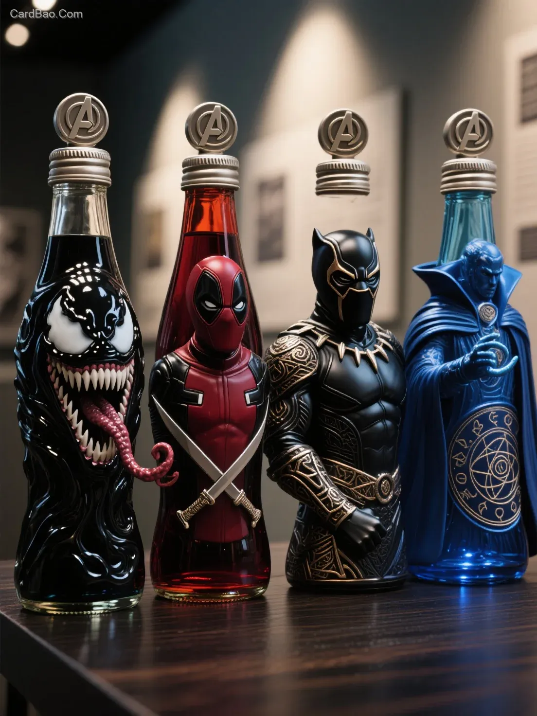 四支彩色玻璃汽水瓶整齐并列,呈现如艺术雕塑展品般的视觉震撼,每支瓶身皆以彩色厚玻璃材质打造,雕刻出四位英雄角色的精致立体浮雕。第一支为漆黑透明玻璃,瓶身包覆狂暴流动的毒液形象,牙齿张开、舌头缠绕瓶颈,浮雕感带有粘液质感,瓶体略为扭曲;第二支为深红玻璃瓶,瓶身雕刻死侍双刀交叉背后的战斗姿态,面罩紧贴轮廓,滑稽中带危险气息,细节真实;第三支为黑曜石玻璃瓶,黑豹的雕刻头盔与身体上盘绕着金属花纹,浮雕呈现如非洲图腾风格,尊贵冷峻;第四支为湛蓝玻璃瓶,奇异博士身披浮雕斗篷,右手施展法阵,瓶身有细密魔法符文盘旋,仿佛随光而动。每支瓶盖为定制金属盖,盖面浮雕角色标志图案。玻璃瓶整体雕工繁复、厚重逼真,陈列于暗色木纹桌面,背景为模糊展览墙,聚光灯照射下瓶身浮雕折射出梦幻般的光泽,无AI感,风格写实而沉浸,质感极强,仿佛为英雄量身打造的纪念瓶系列。