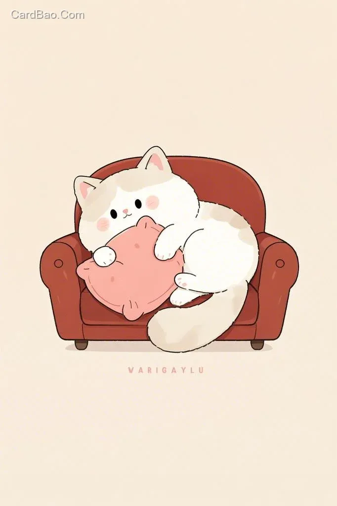 A fluffy, chubby white cat lying on the sofa, hugging a throw pillow, playful and cute, with a solid color background, chibi style, line illustration, minimalist.