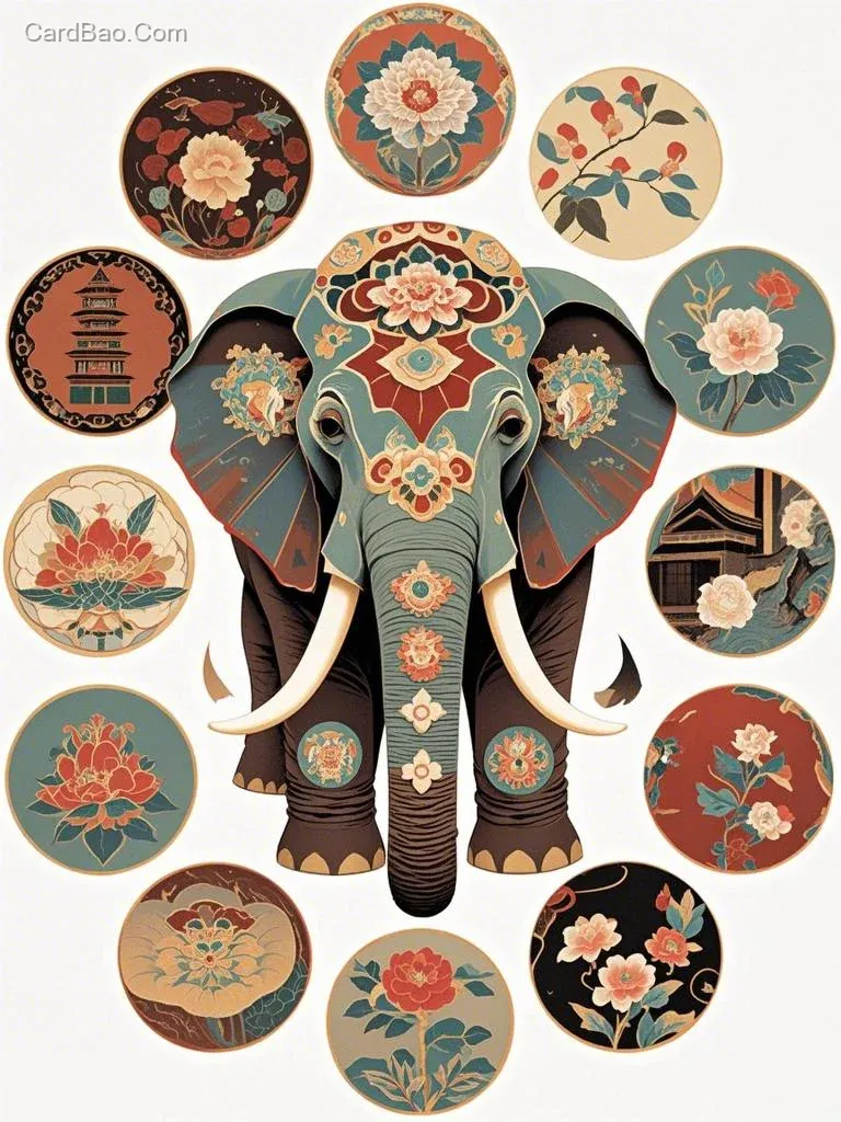 金属色,Hieronymus Bosch,美景,behance, 干净的线条,平面插画,拼贴风格,巩义的各种历史元素,巩义博物馆,洛神图,飞天图,北宋簪花,头饰,所有图案用一只大象的造型呈现,中国元素,美丽的色彩,高密度,充满细节,背景是白色,海报设计,复杂和简单的对比,花纹突出,商业插画,极简主义,再结合敦煌。