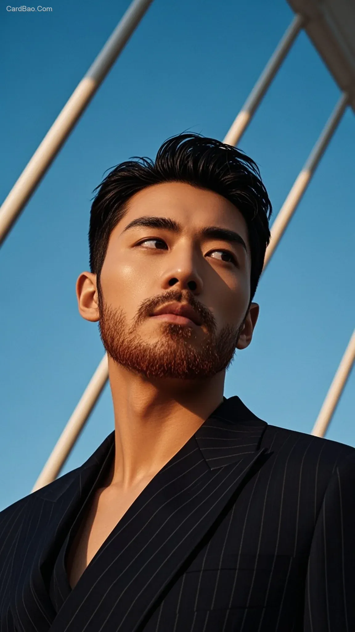 创意亚洲英俊刚毅阳刚男性人像,棱角分明的脸,微胡茬,四周大面积留白,野兽派设计,生动的色彩,浪漫主义,冷峻有棱角的面部,表情冷峻,阳刚,硬朗,健硕,不苟言笑,表情冷峻,黝黑深深古铜色的皮肤,仰角拍摄