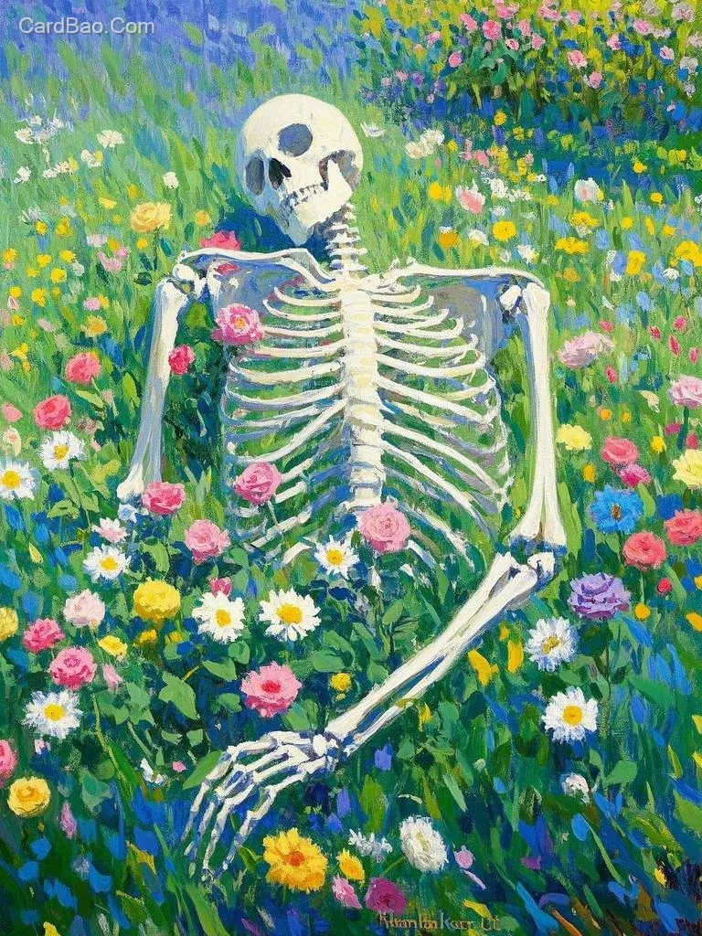 莫奈,gustav klimt,油画氛围,笔触,春天的景色,阳光洒落,白色的肋骨骨架躺在绿色的草地里,缝隙里长出粉色黄色白色蓝色的玫瑰,超细腻的线条感,令人惊叹的细节,辛烷值,浅景深,大师作品,故事感,镜头感。vivid colours,梦幻七彩