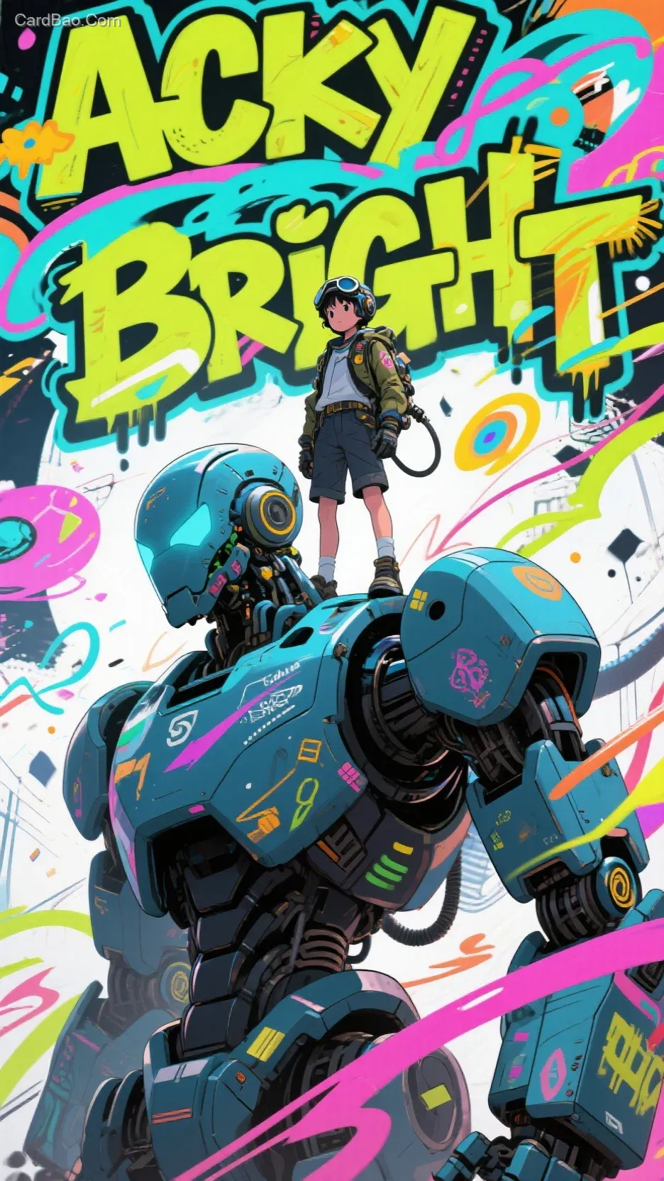 Crafted with Unreal Engine 5, in Acky Bright style, featuring flowing graffiti lines and adorned with decorative elements. The scene, where abstract and avant-garde trendy elements collide, exhibits the artistic characteristics of Yoshitaka Amano, with no text elements. A pilot boy stands on the shoulders of a giant robot.