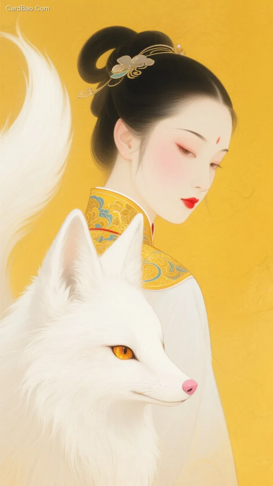 Behind the fox is the profile of a woman. Her skin is fair and delicate, her features exquisite; with lowered eyes and eyebrows, her expression is gentle and serene. She wears a typical classical Oriental makeup: slender eyebrows, rosy cheeks, and vibrant red lips, all exuding soft beauty. Her hair is jet-black and shiny, partly styled into an updo, with hints of ornaments visible among the tresses. She is dressed in traditional attire, with the collar adorned with colorful patterns; though only a corner is visible, it adds details and layers of color to the scene.