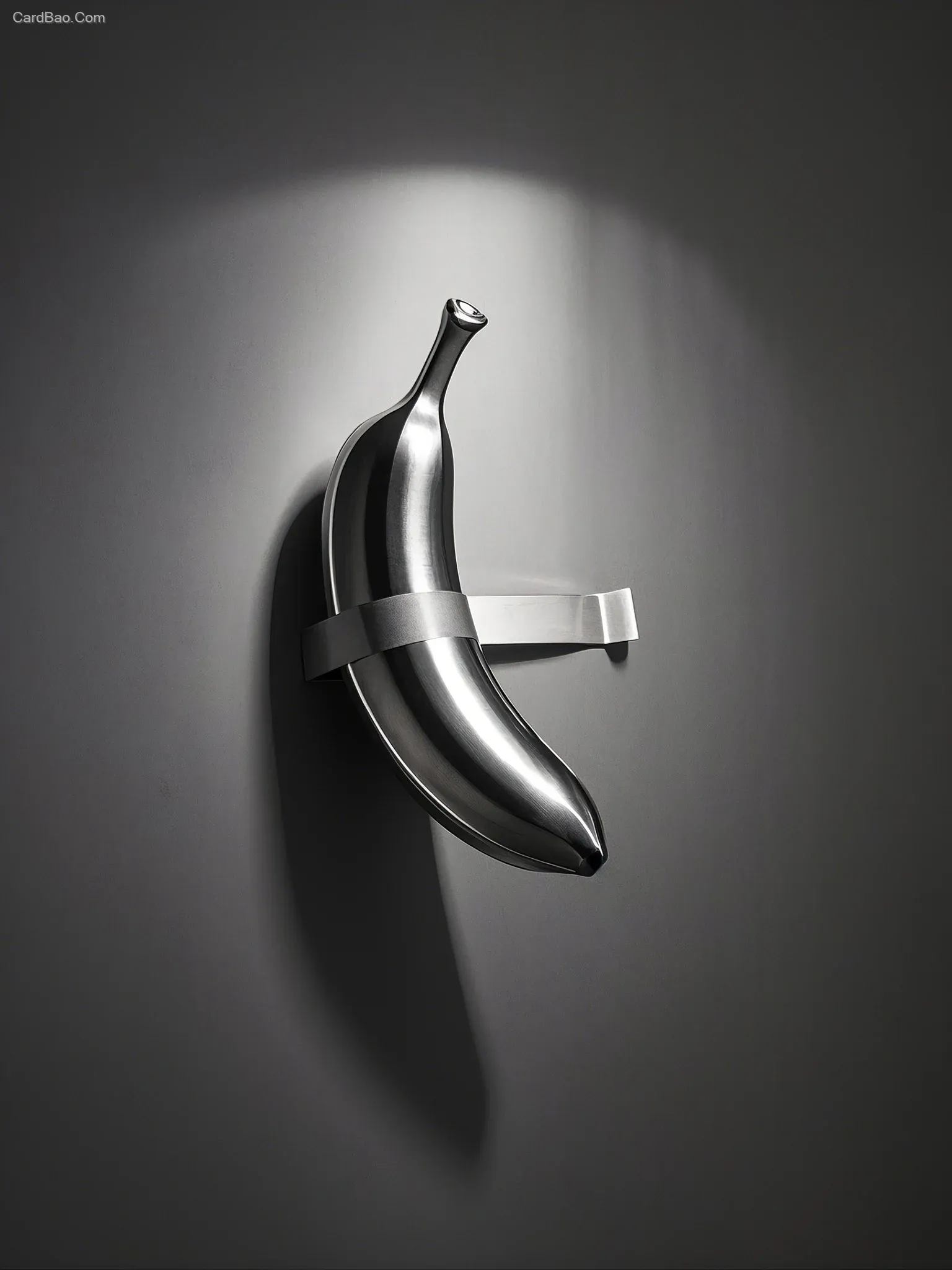 反光的银色金属,Maurizio Cattelan艺术作品Comedian,金属宽胶带斜着粘在香蕉上把香蕉固定在墙上,金属墙,金属胶带,金属香蕉,水平垂直居中对齐,创意艺术作品,金属发光质感,极简主义,简单干净,极致质感,极致真实,顶光,艺术展打光