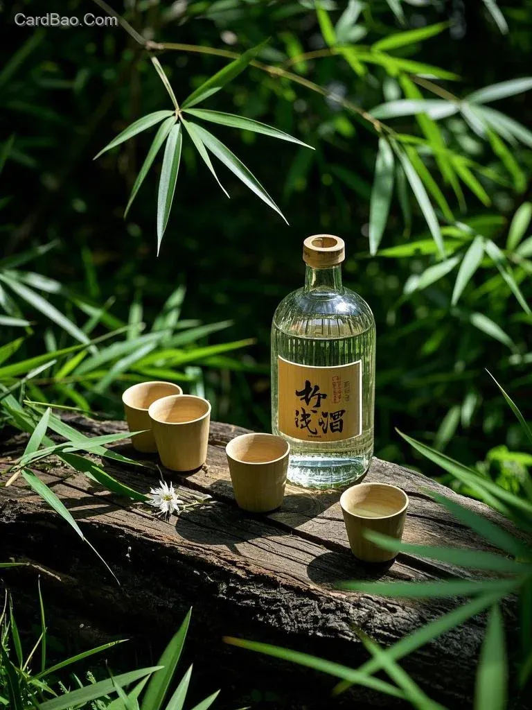 选择户外的一片竹林或花园,以绿色植物和自然光为主。一块原木色的木板,上面放置白酒瓶和几个竹制酒杯。周围点缀一些野花或竹叶,营造自然氛围。利用阳光透过树叶的斑驳光影,增加画面的层次感。超高清