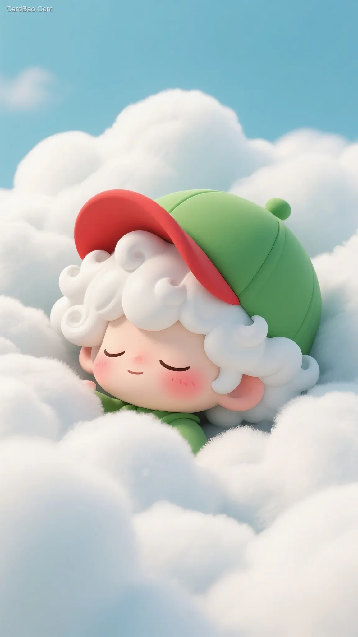 画面中间一个卡通人物,蓬松卷翘的白色头发,头头戴一顶绿色的帽子(帽檐部分为红色),人物闭着眼睛,脸颊泛着红晕,躺在白云里上,被云层包裹。
