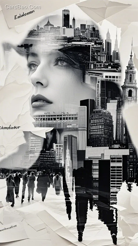 风格人像摄影,黑白淡彩,双重曝光,模糊人像剪影轮廓与世界各城市场景完美融合,留白,拼贴,撕纸,笔刷,抽象,呈现奇妙而绝佳意境,强烈的胶片颗粒感,情绪氛围感拉满,虚实的层次感,丰富的内容力,erkindemir的风格,未来风,故障风,超现实主义,细节完美,