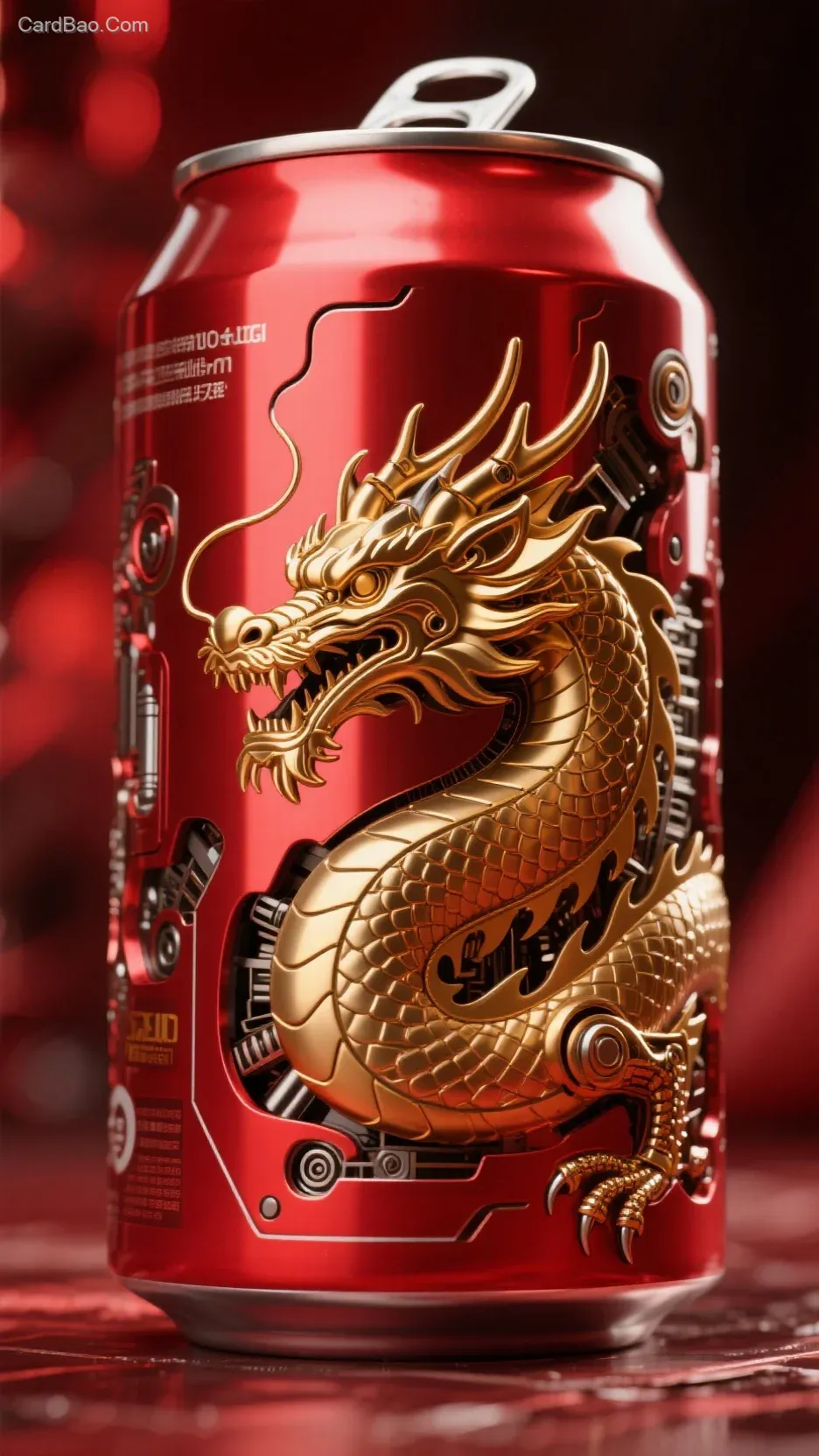 机械化易拉罐,艺术品,具有机械构造,呈现出精密机械化风。一个巨大易拉罐,上面刻着一个突出的金色机械龙,涉及包装设计,产品摄影,突出机械易拉罐,背景简单有质感,色彩红为主色