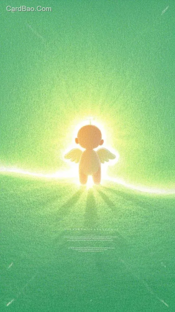 大面积留白,绿色调,中间是一团淡淡的暖光,向四周散开,里面有一个可爱的婴儿,背着天使的翅膀,孤独感,空旷,画面极度干净,极简,超现实主义插画,极简设计,朦胧美,宁静神秘,清新自然,怪诞童话,颗粒全息打印,宏观镜头,色彩明亮柔和,内容简洁,毛毡质感,个性化