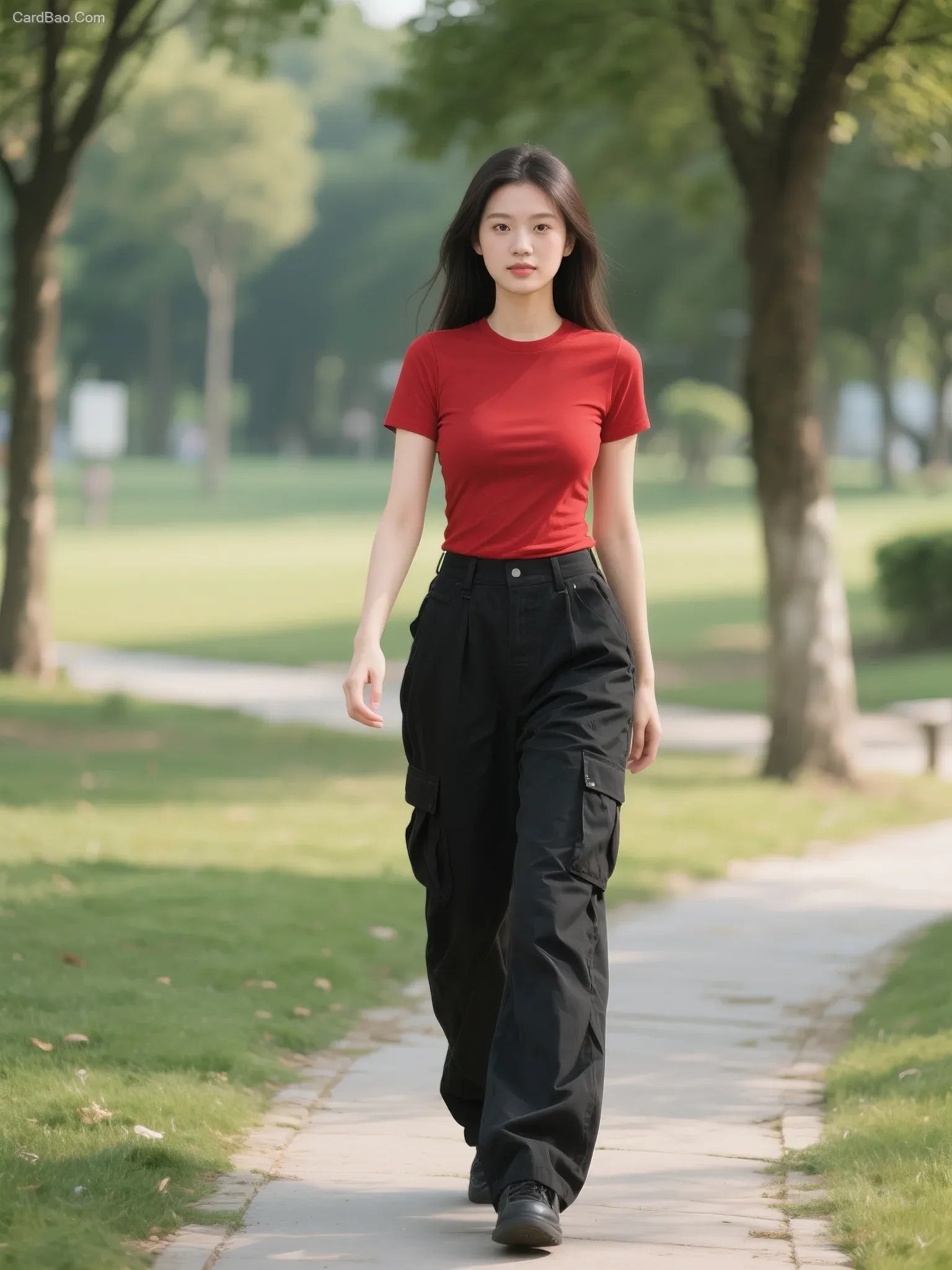 早上,在公园,遇到一个大学生美女,迎面走来,身材比例满分,身材高挑,穿着黑色宽松的工装裤,紧身的红色T恤,清秀的脸蛋儿,全身照。高清
