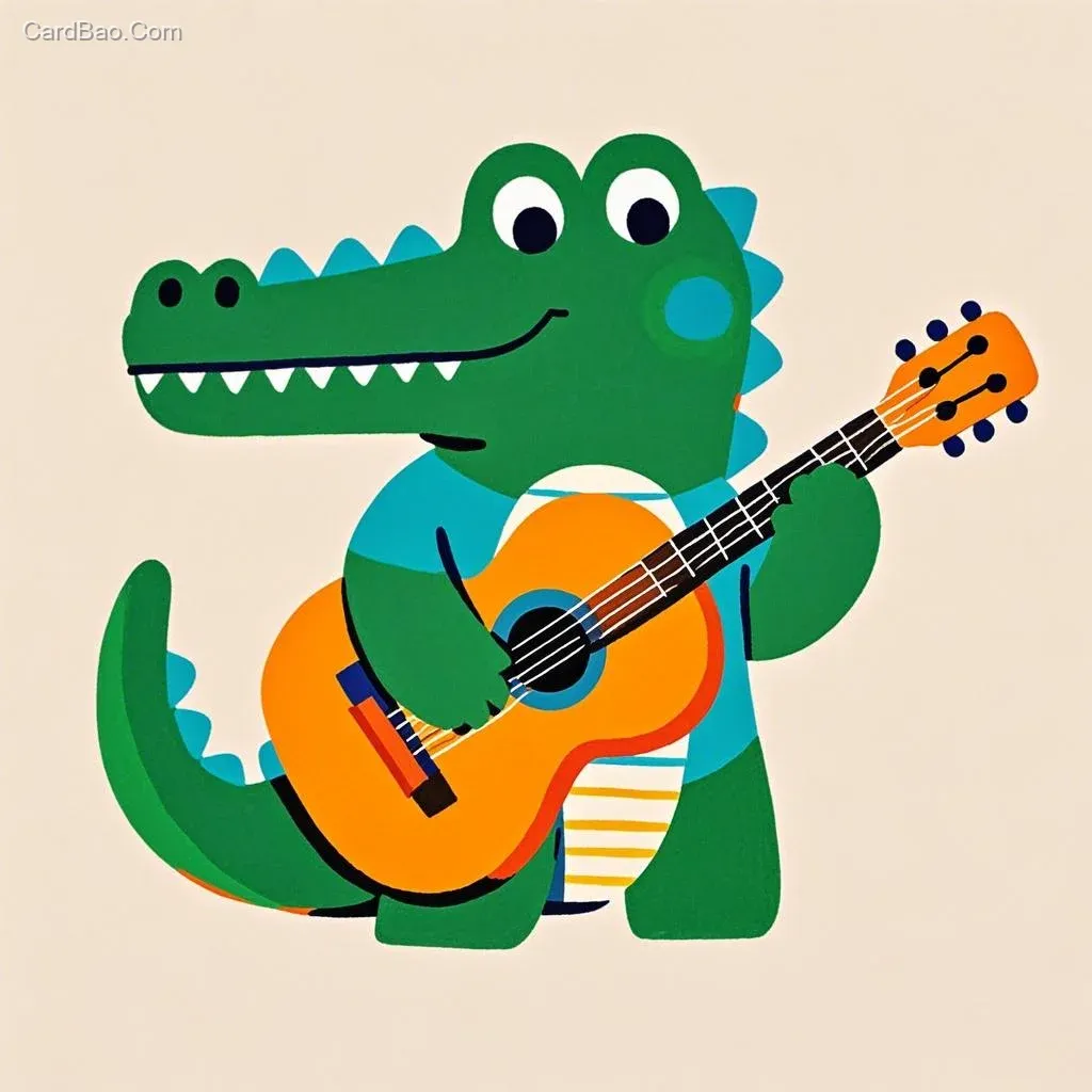 A cute crocodile playing a guitar, in a simple, minimalistic style. Reminiscent of children's book illustrations, the image is colorful, with no background, bold colors, and strong lines, in the style of Henri Matisse. Boho neutral plain background.