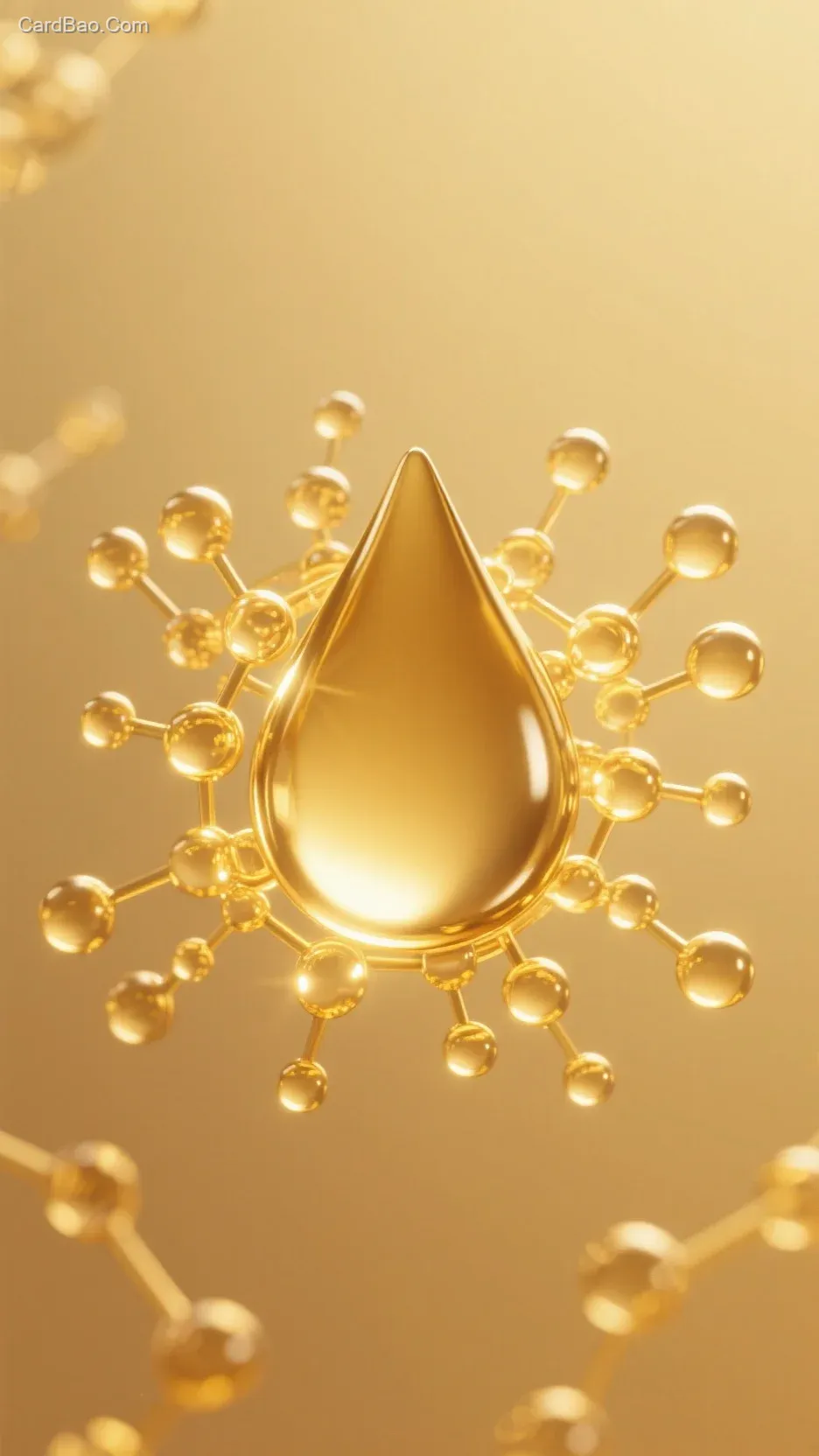 一个金色的水滴,周围都是分子,水滴金色,氛围光,发光金色,背景金色,纯色背景,浅金色背景