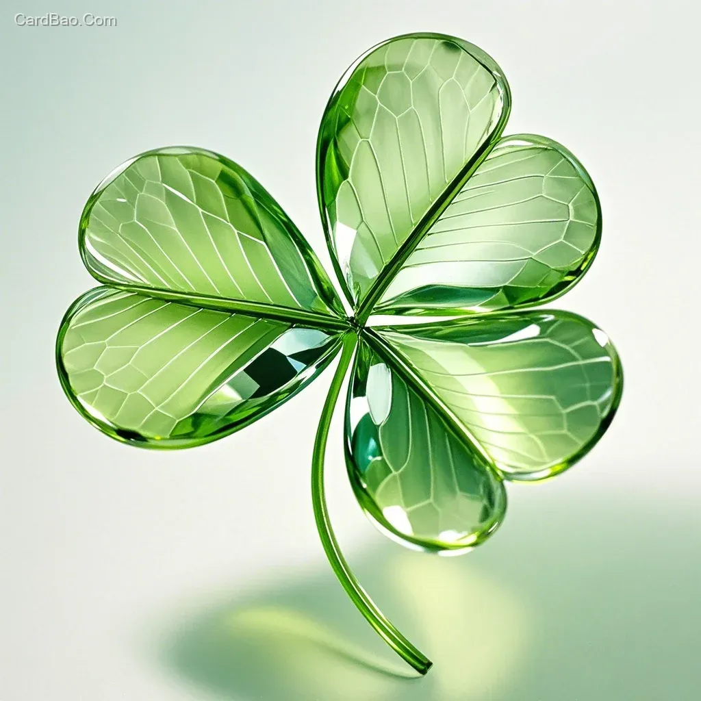 透明绿色水晶四叶草 通透 薄如蝉翼 高透 超清晰 逼真 叶片脉络清晰 细节丰富 纯色背景 柔光